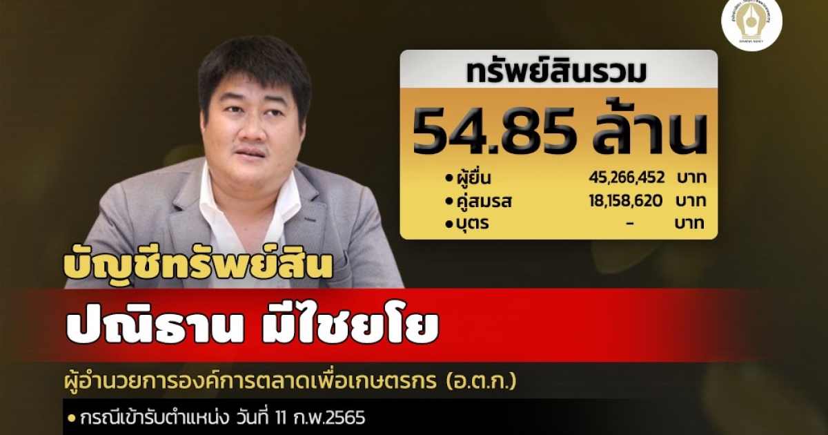 ทรัพย์สิน 63.42 ล้านบาท 'ปณิธาน มีไชยโย' ผู้อำนวยการ อ.ต.ก.รายได้ต่อปี 3.66 ล้านบาท สะสมพระเครื่องชื่อดัง อาทิ พระกำแพงซุ้มกอ - พระสมเด็จวัดระฆังพิมพ์ใหญ่ - สมเด็จจิตรลดา ภรรยา มีทองคำแท่ง น้ำหนักรวม 182 บาท