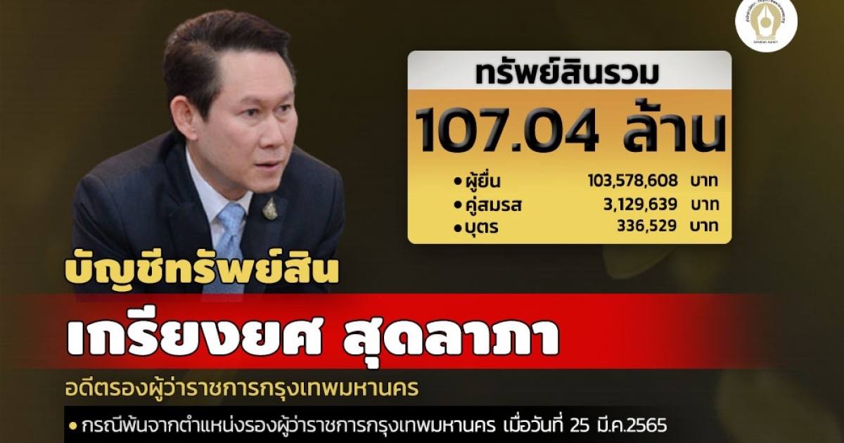 ทรัพย์สิน 2 รองผู้ว่าฯ ยุค ‘อัศวิน ขวัญเมือง’ หลังพ้นตำแหน่ง ‘เกรียงยศ ’ 107.04 ล้านบาท ที่ดิน 20 แปลง บ้านเดี่ยว 2 หลัง รวม 88.26 ล้านบาท สะสมนาฬิกาหรู 5 เรือน 4.45 ล้านบาท