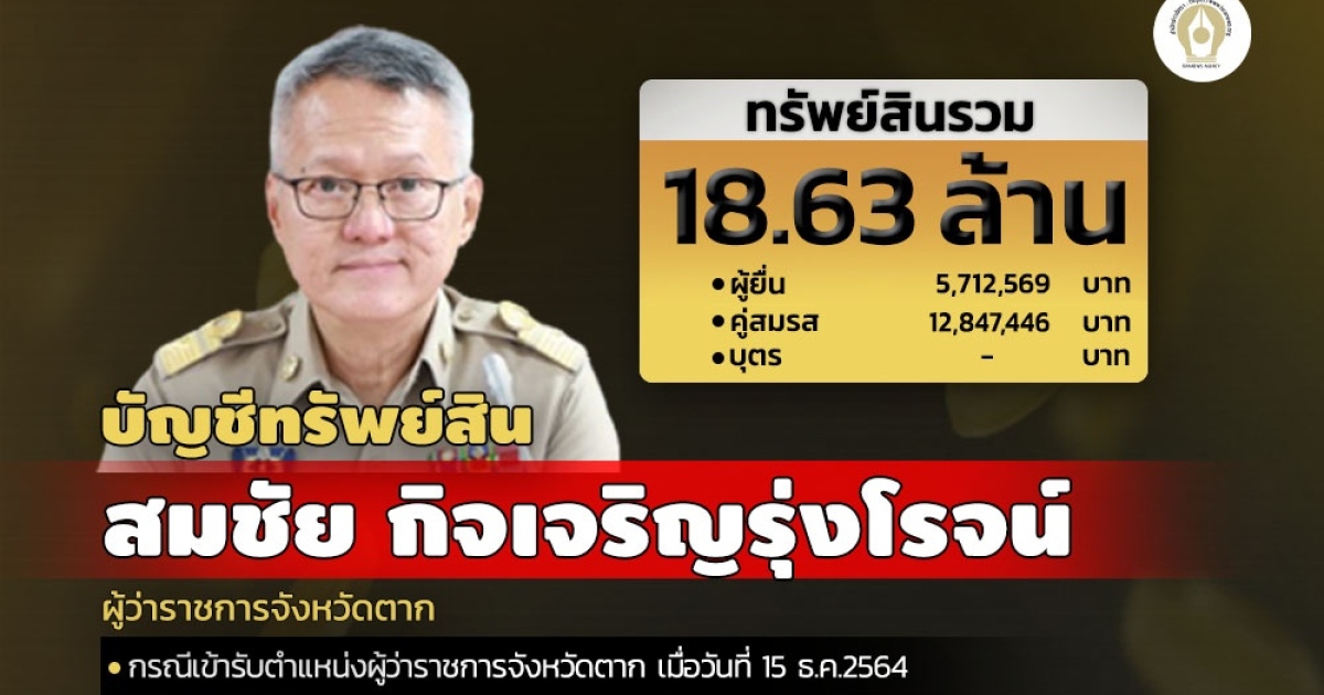 ทรัพย์สิน 18.63 ล้านบาท 'สมชัย กิจเจริญรุ่งโรจน์' นั่งผู้ว่าฯตาก - คู่สมรส ถือเงินสด 1.2 ล้านบาท เงินฝาก 16 บัญชี 8.03 ล้านบาท สะสมปืน 3 กระบอก พระเครื่องเลี่ยมทอง 15 องค์