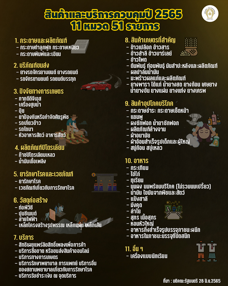 ครม.เห็นชอบการกำหนดสินค้าและบริการควบคุม ปี 2565 รวม 11 หมวด 51 รายการ อาทิ ปุ๋ย น้ำมัน ชุดนักเรียน อาหารกึ่งสำเร็จรูป ยังคงเป็นสินค้าควบคุม ซึ่งเป็นไปตามมติคณะกรรมการกลางว่าด้วยราคาสินค้าและบริการครั้งที่ 3/2565