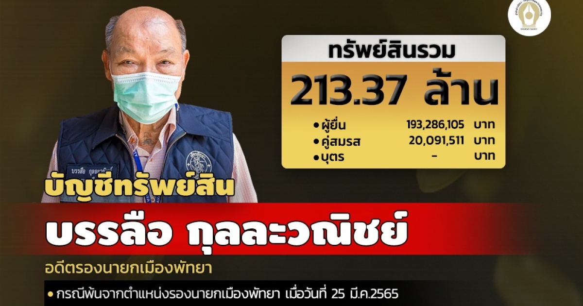 ทรัพย์สิน 213.37 ล้านบาท 'บรรลือ กุลละวณิชย์' พ้นรองนายกเมืองพัทยา ถือครองที่ดินพร้อมคู่สมรส 58 แปลง เนื้อที่รวม 57 ไร่ มูลค่ารวม 132.25 ล้านบาท อยู่ใน จ.ชลบุรี ทั้งหมด