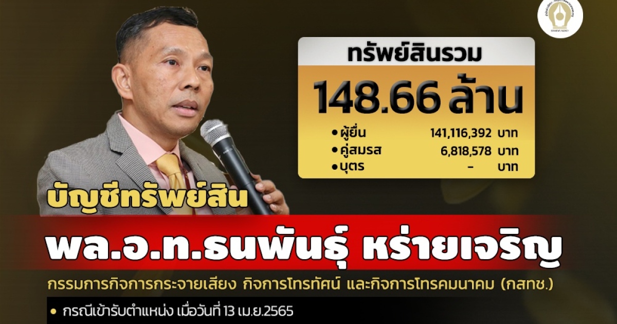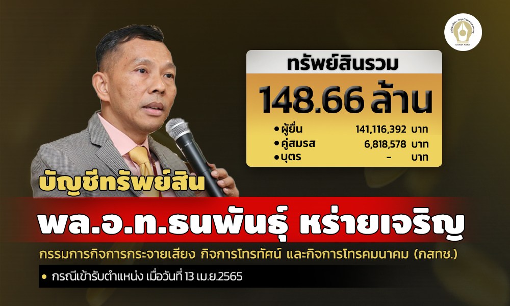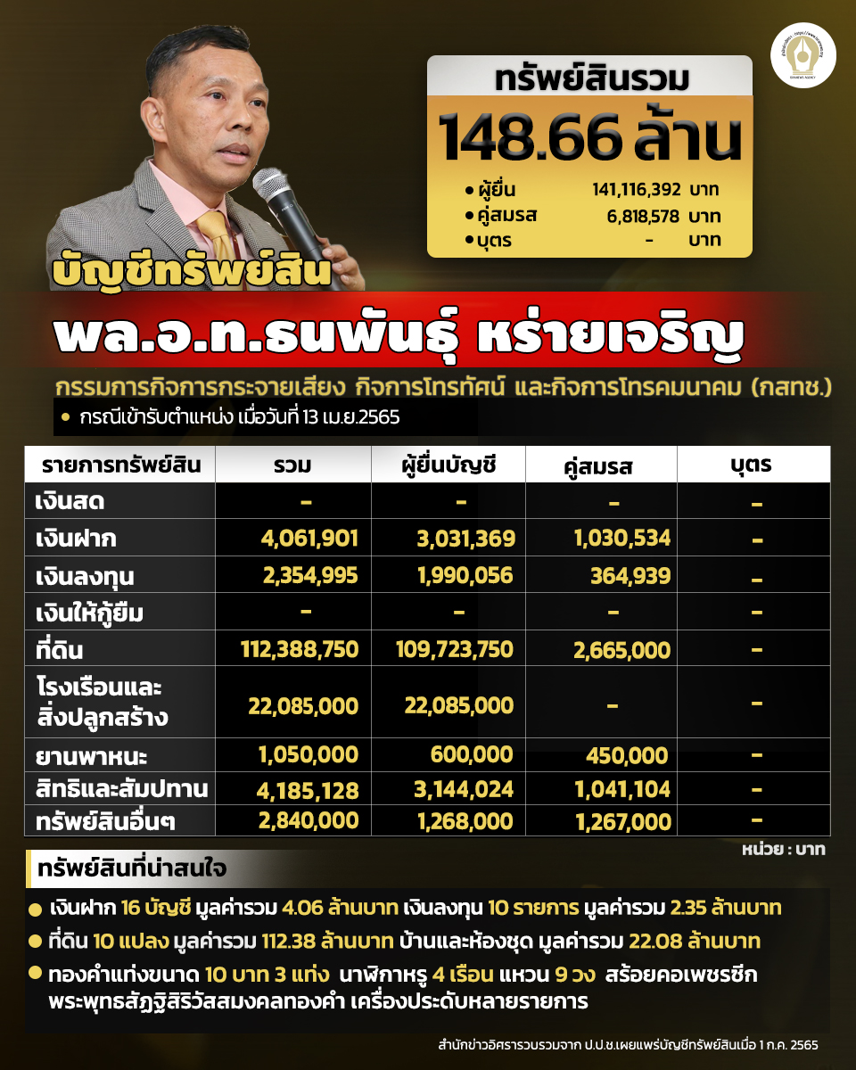 ทรัพย์สิน 'พล.อ.ท.ธนพันธุ์ หร่ายเจริญ' บอร์ด กสทช. ที่ดิน 10 แปลง เนื้อที่รวม 59 ไร่ ที่ ฉะเชิงเทรา-โคราช-กทม. มูลค่ารวม 112.38 ล. บ้าน-ห้องชุด 7 หลัง 22.08 ล. แจ้งรายได้ต่อปี 4.82 ล. จากเงินเดือน บำเหน็จ บำนาญ