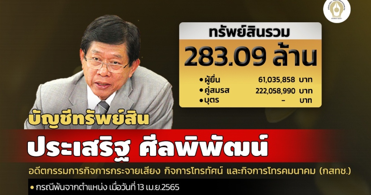 ทรัพย์สิน 283 ล้านบาท 'ประเสริฐ ศีลพิพัฒน์' พ้นบอร์ด กสทช. เงินฝาก 13 บัญชี 17.03 ล้านบาท เงินลงทุน 13 รายการ 77.98 ล้านบาท ที่ดิน 14 แปลง 159.76 ล้านบาท บ้าน 2 หลัง 12 ล้านบาท