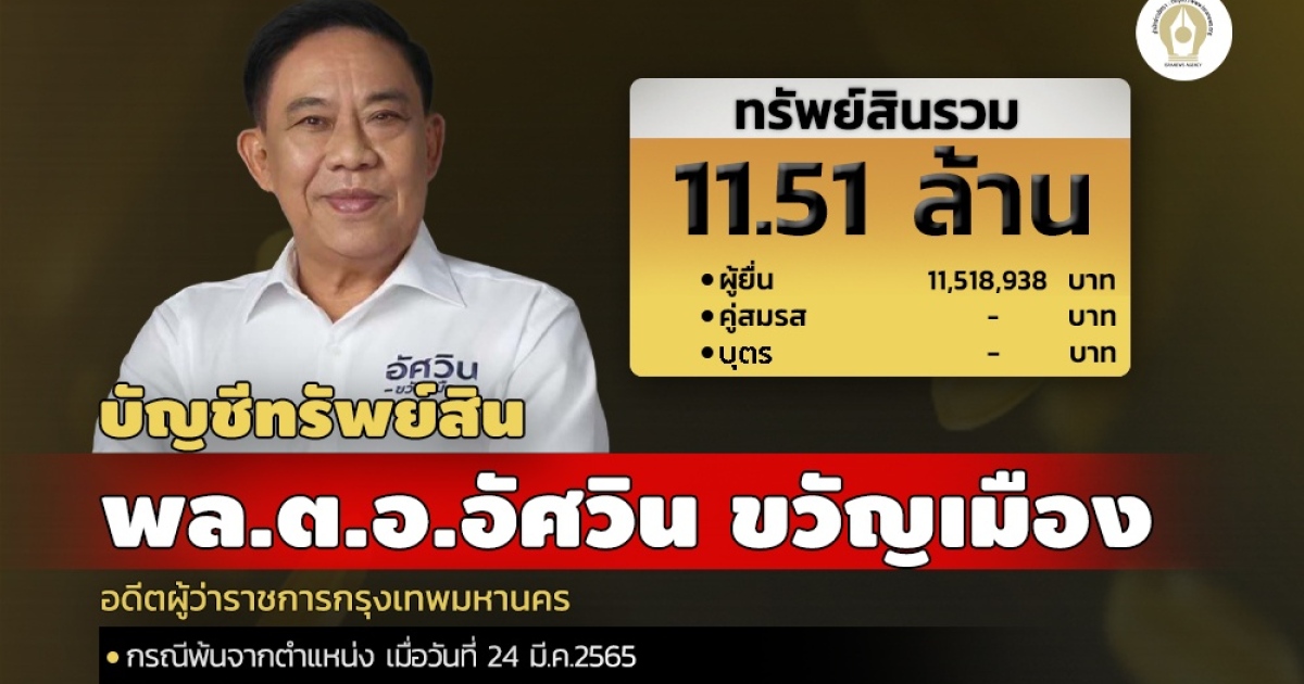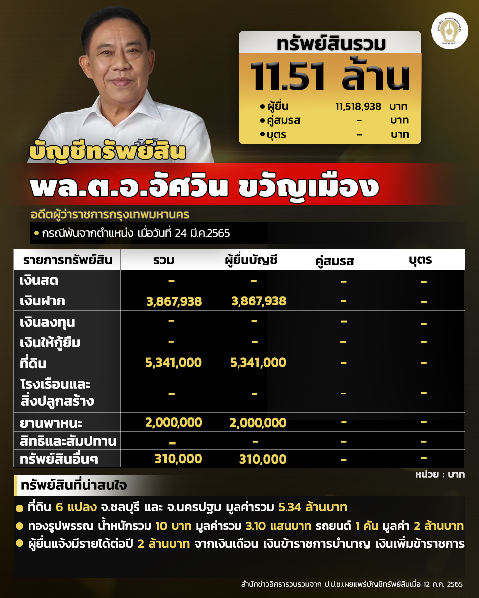 ทรัพย์สิน 11.51 ล. 'อัศวิน ขวัญเมือง' พ้นผู้ว่าฯ กทม.เงินฝาก 4 บัญชี 3.86 ล้านบาท ที่ดิน 6 แปลงที่ชลบุรี-นครปฐม 5.34 ล้านบาท แจ้งรายได้ต่อปี 2 ล้านบาทจากเงินเดือน-บำนาญ