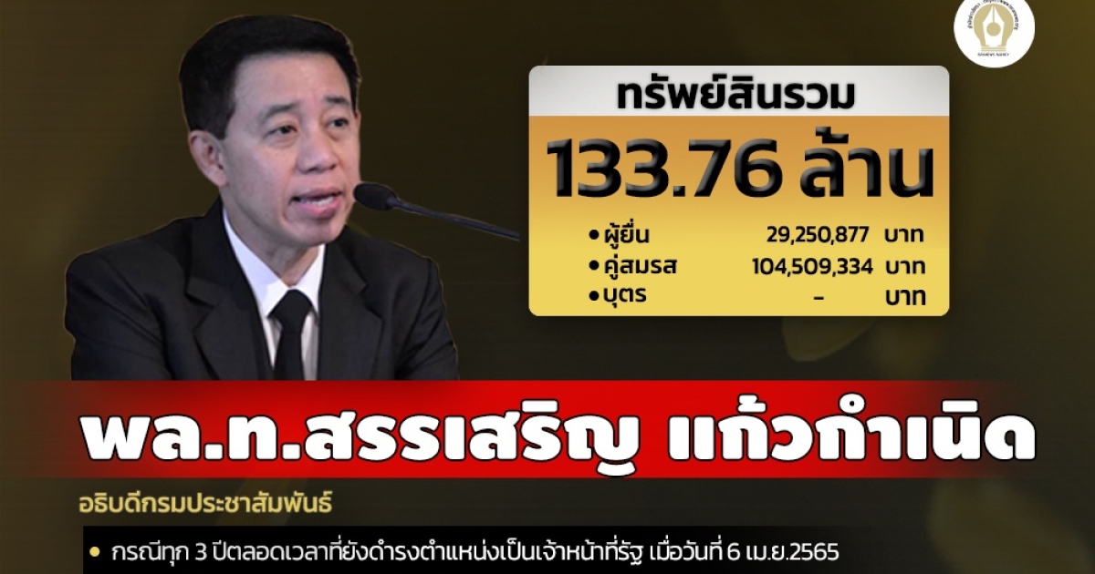 ทรัพย์สิน 133.76 ล้านบาท 'พล.ท.สรรเสริญ แก้วกำเนิด' นั่งอธิบดีกรมประชาสัมพันธ์ครบ 3 ปี เงินฝาก 21 บัญชี 3.56 ล้านบาท เงินลงทุน 62 รายการ 37.45 ล้านบาท ที่ดิน - บ้าน 19.52 ล้านบาท ภรรยา สะสมเครื่องเพชร นาฬิกา 63.91 ล้านบาท