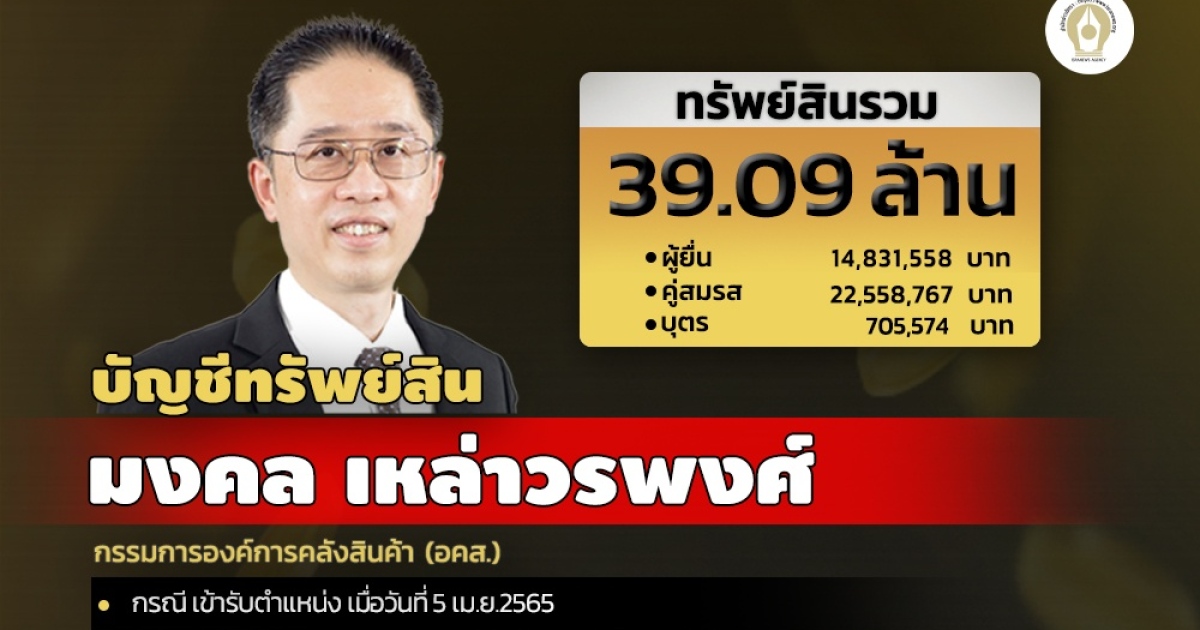 ทรัพย์สิน 39.09 ล้านบาท 'มงคล เหล่าวรพงศ์' นั่งบอร์ด อคส.มีเงินฝาก 33 บัญชี 2.95 ล้านบาท เงินลงทุน 29 รายการ 9.82 ล้านบาท ห้องชุด-ตึกแถว 18.07 ล้านบาท รายได้ต่อปี 5 ล้านบาท