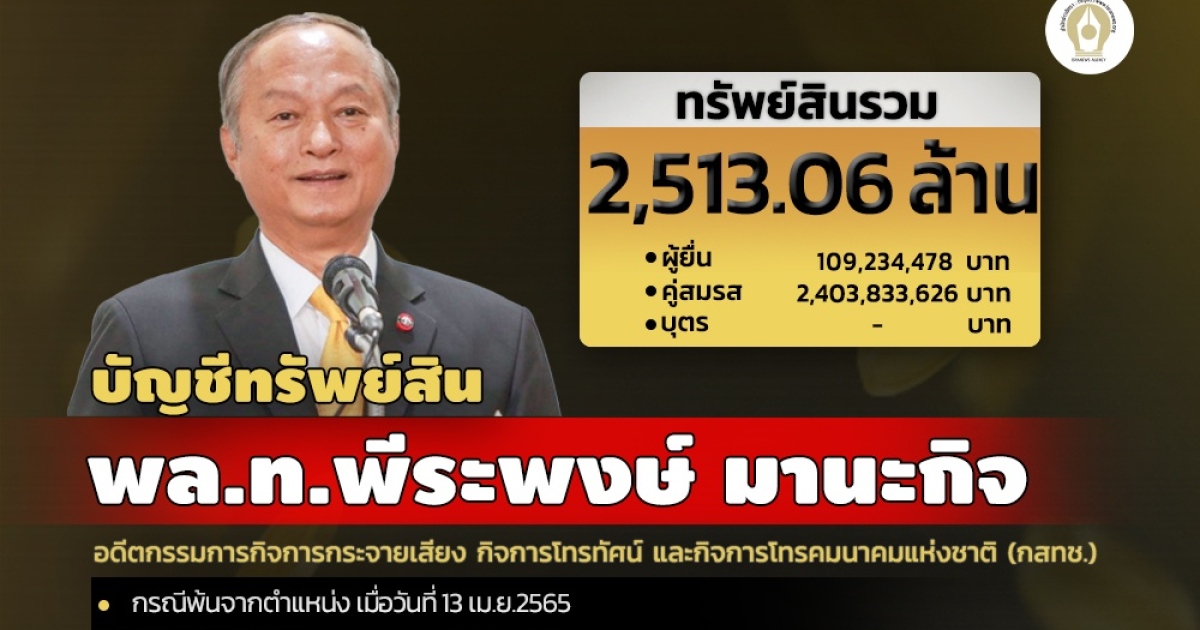 ทรัพย์สิน 2,513.06 ล้านบาท 'พล.ท.พีระพงษ์ มานะกิจ' พ้น กสทช. ที่ดิน 65 แปลง 142-0-386 ไร่ ส่วนใหญ่ใหญ่ใน กทม. 412.28 ล้านบาท ภรรยานักธุรกิจ มีชุดเครื่องเพชร Van cleef & Arpels มูลค่า 230.67 ล้านบาท จ่ายเบี้ยประกันชีวิตปีละ 54 ล้านบาท