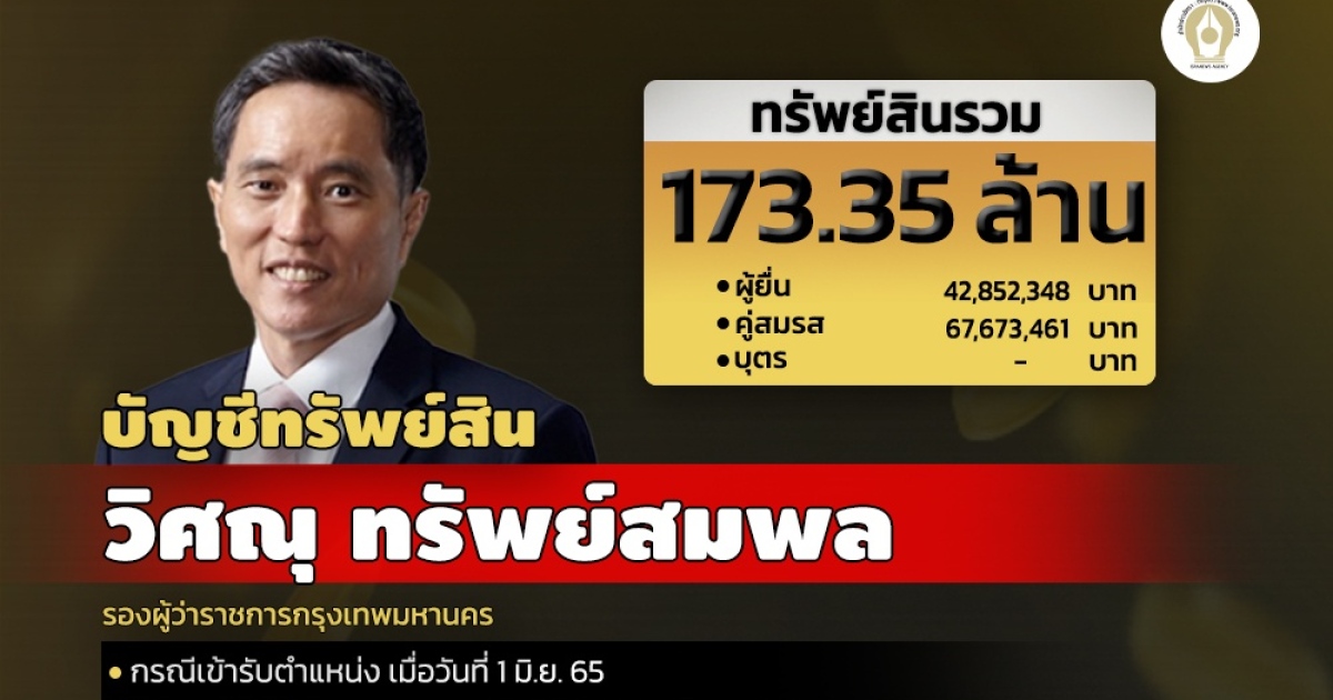 ทรัพย์สิน 173.35 ล้านบาท 'วิศณุ ทรัพย์สมพล' นั่งรองผู้ว่าฯ กทม. เงินลงทุน 21 รายการ 61.03 ล้านบาท หนี้สิน 31.71 ล. ภรรยามีสินทรัพย์ดิจิทัล 2.39 ล้านบาท - ปี 61 รับมรดกที่ดินปทุมธานี 37.58 ล้านบาท