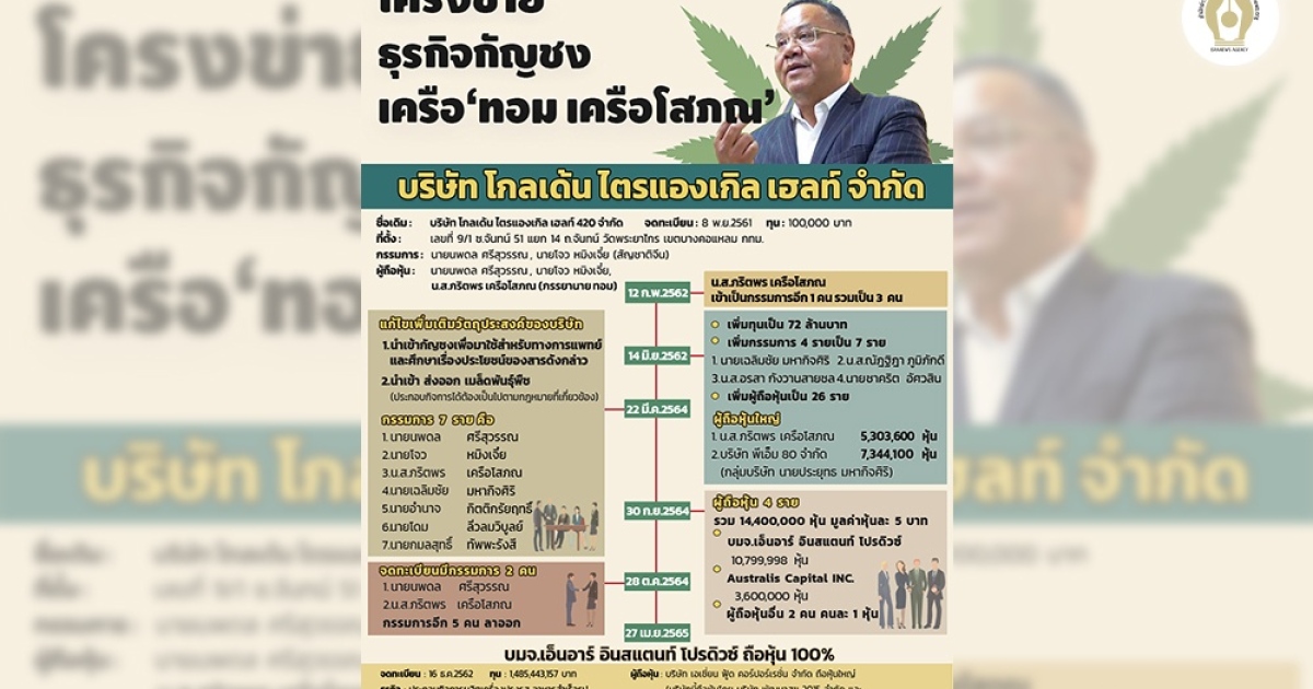 เปิดข้อมูลบริษัท โกลเด้น ไตรแองเกิล เฮลท์ ธุรกิจนำเข้ากัญชง เครือ 'ทอม เครือโสภณ' พบ พีเอ็ม 80 ของ 'ประยุทธ์ มหากิจศิริ' เคยถือหุ้นใหญ่ ขณะที่ 'กึ้ง - เฉลิมชัย มหากิจศิริ' และคนนามสกุล 'ทัพพะรังสี' เคยนั่งเป็นกรรมการ ขณะที่ ล่าสุด บมจ.เอ็นอาร์ อินสแตนท์ โปรดิวซ์ โฮลดิ้ง ชื่อ 'เอเชี่ยน ฟู้ด คอร์ปอร์เรชั่น' บริษัทในฮ่องกงทับซ้อนอีกชั้น