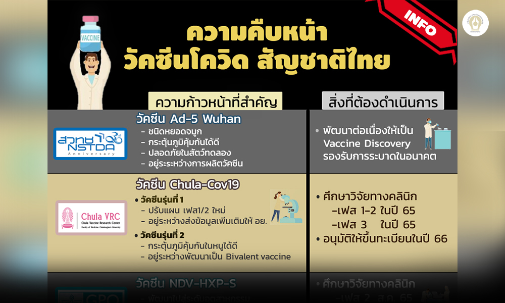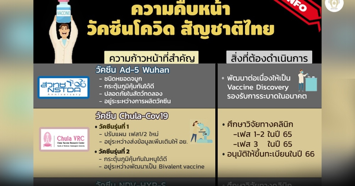 “…การพัฒนาวิจัยวัคซีน Chula-Cov19 จะทำการศึกษาวิจัยทางคลินิกในระยะที่ 1-2 ภายในปี 2565 นี้ และจะศึกษาวิจัยทางคลินิกระยะที่ 3 ในปี 2566 โดยคาดว่าจะได้รับการอนุมัติให้ขึ้นทะเบียน ภายในปี 2567…”