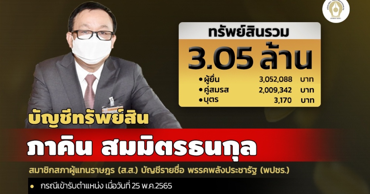 ทรัพย์สิน 3.05 ล้านบาท 'ภาคิน สมมิตรธนกุล' นั่ง ส.ส.พรรคพลังประชารัฐ มีเงินสด 1 ล้านบาท เงินฝาก 3.9 หมื่นบาท ส่วนภรรยาแจ้งมีเงินลงทุน 2 ล้านบาทจากการถือหุ้น หจก. 2 แห่ง