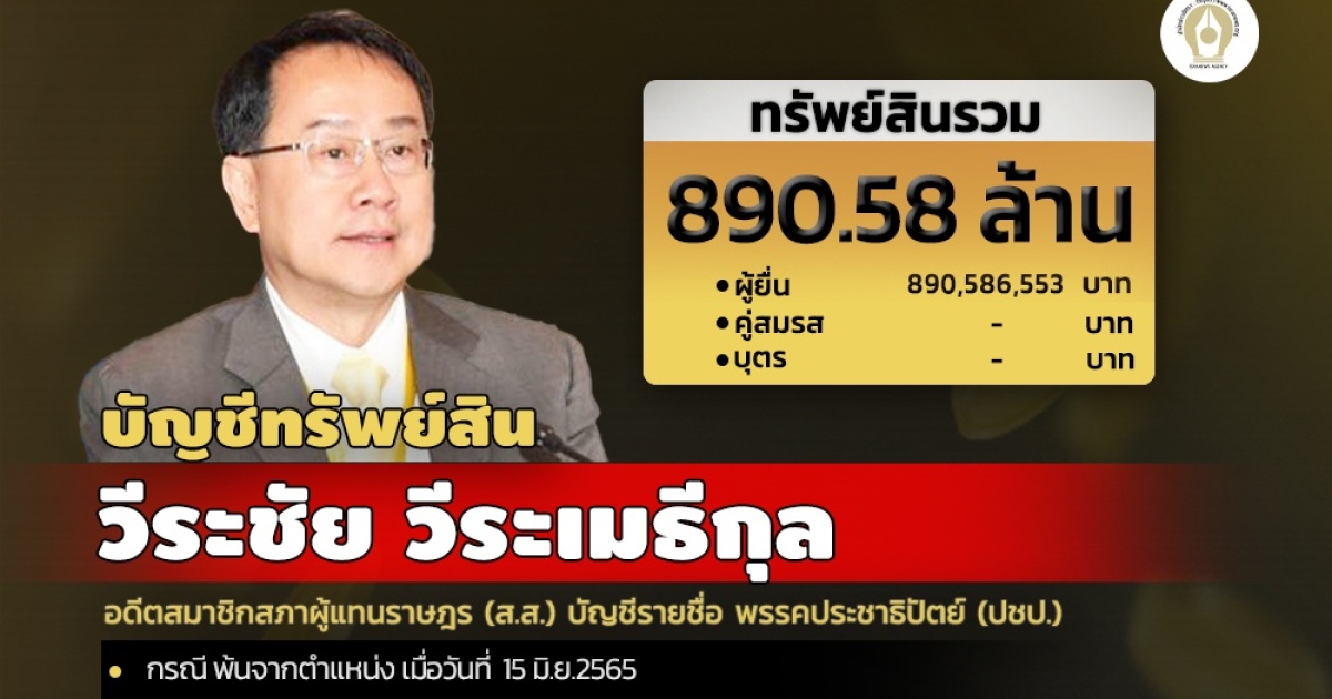 ทรัพย์สิน 890.58 ล้านบาท 'วีระชัย วีระเมธีกุล' เงินลงทุน 590.92 ล้านบาท ที่ดิน 210 ไร่ 194.76 ล้านบาท ส่วนใหญ่อยู่ใน จ.สมุทรปราการ มีรายได้ 75.13 ล้านบาทจากเงินปันผล-ขายที่ดิน