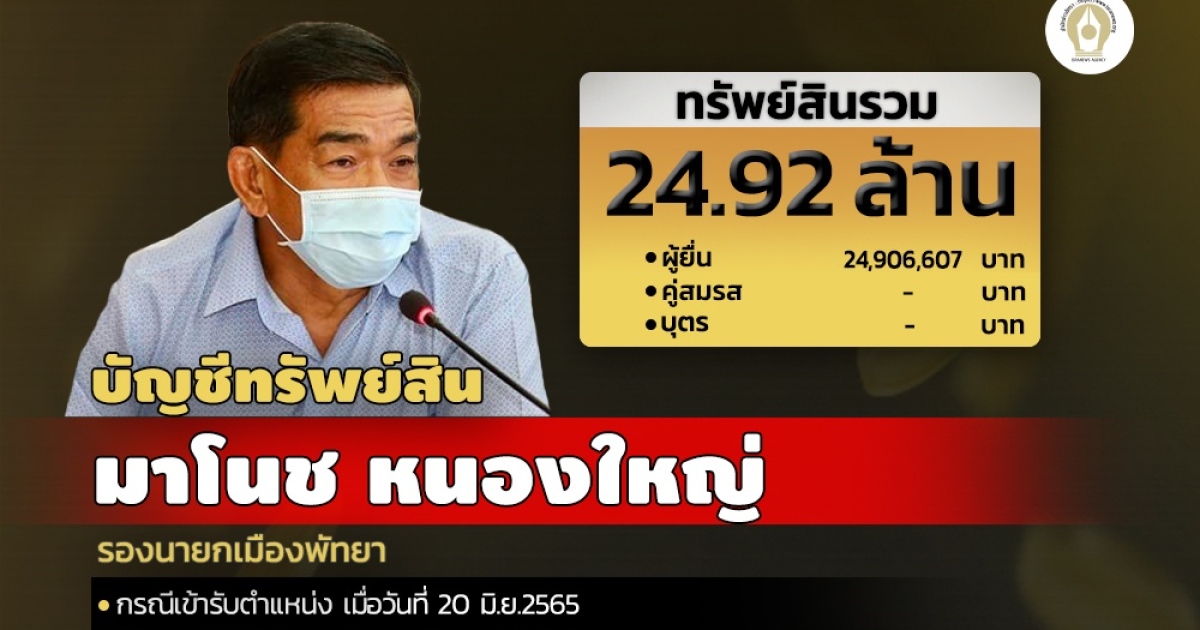 ทรัพย์สิน 24.92 ล้านบาท 'มาโนช หนองใหญ่' นั่งรองนายกเมืองพัทยาอีกสมัย หลังเพิ่งพ้นตำแหน่ง 3 เดือน แจ้งเงินฝากลดลง 1.2 แสนบาท
