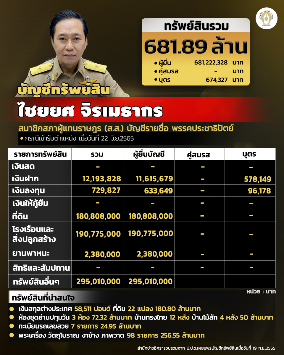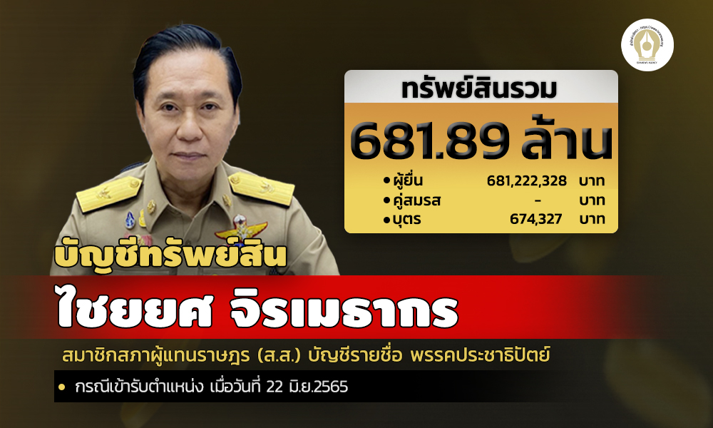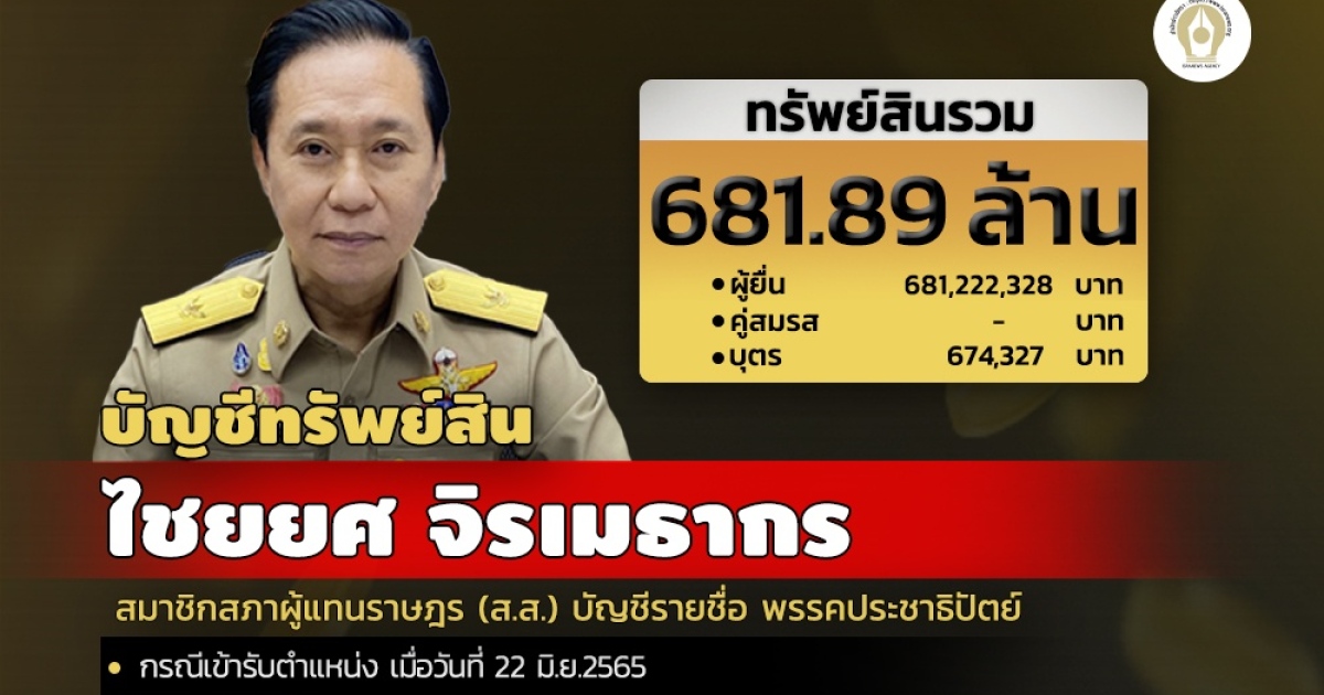 ทรัพย์สิน 681.89 ล้านบาท 'ไชยยศ จิรเมธากร' นั่ง ส.ส.ประชาธิปัตย์ ที่ดิน 373 ไร่ 180 ล้านบาท คอนโดหรูกลางกรุง ห้อง 72.32 ล้านบาท ทาวเฮ้าส์ที่อังกฤษ 26 ล้านบาท สะสมปืน 36 กระบอก พระเครื่อง วัตถุโบราณ งาช้าง ภาพวาด 98 รายการ มูลค่ารวม 256.55 ล้านบาท
