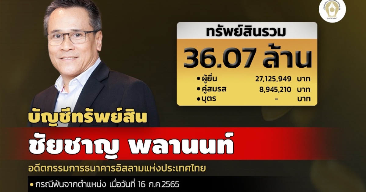 ทรัพย์สิน 36.07 ล้านบาท 'ชัยชาญ พลานนท์' พ้นบอร์ดธนาคารอิสลามแห่งประเทศไทย เงินฝาก 13 บัญชี 8.17 ล้านบาท เงินลงทุน 8 รายการ 10.95 ล้านบาท ที่ดิน-ห้องชุด 15 ล้านบาท