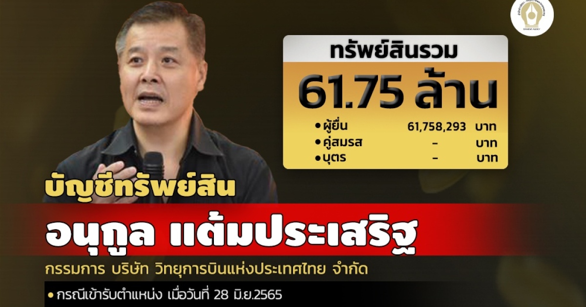 ทรัพย์สิน 61.75 ล้านบาท 'อนุกูล แต้มประเสริฐ' นั่งบอร์ดวิทยุการบินฯ เงินฝาก 11 บัญชี 41.30 ล้านบาท เงินลงทุน 17 รายการ 11.93 ล้านบาท ถือเหรียญดิจิทัล 7 รายการ