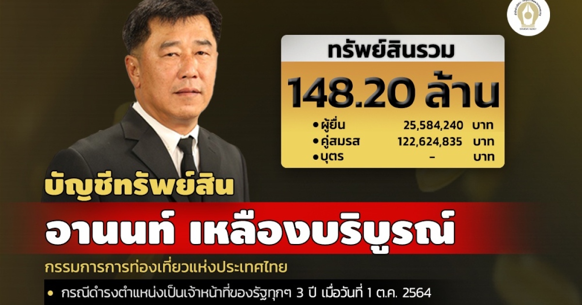 ทรัพย์สิน 148.20 ล้านบาท ‘อานนท์ เหลืองบริบูรณ์’ นั่งรองปลัดคมนาคม-บอร์ด ททท.ครบ 3 ปี เงินฝาก 6 บัญชี 12 ล้านบาท เงินลงทุน 11 รายการ 13 ล้านบาท พบคู่สมรสถือเงินลงทุน 33 รายการ มูลค่า 109 ล้านบาท