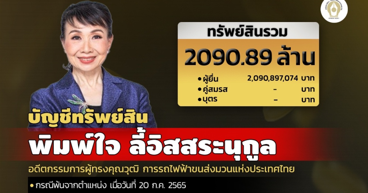 รายได้ 71 ล.ต่อปี ! เจาะทรัพย์สิน 2,090.89 ล. ‘พิมพ์ใจ ลี้อิสสระนุกูล’ พ้นตำแหน่ง บอร์ดผู้ทรงฯ รฟม. เงินฝาก 28 บัญชี รวม 438.46 ล้าน เงินลงทุน 19 รายการ 1,100.55 ล. เครื่องประดับ 128 ชิ้น 127.82 ล. พระเครื่อง-พระพุทธรูปประเมินค่าไม่ได้