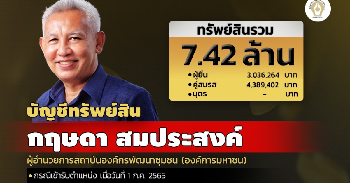 เปิดทรัพย์สิน ‘กฤษดา สมประสงค์’ ผอ.สถาบันพัฒนาองค์กรชุมชน 7.42 ล.รวมภรรยา เฉพาะตัว 3.03 ล้าน เงินฝาก 8 บัญชี 4.8 หมื่น ทาวเฮ้าส์ 1 หลัง 1.2 ล. กบข. 1.26 ล. คู่สมรส 4.3 ล. มีรายได้เพียงปีละ 4.8 หมื่น