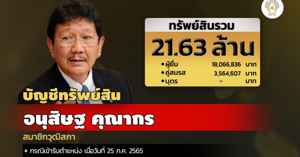 เปิดทรัพย์สิน สว.ใหม่ ‘อนุสิษฐ คุณากร’ ทรัพย์สินรวมภรรยา 21.63 ล้าน เฉพาะตัว 18.06 ล้าน เงินฝาก 5 บัญชี 4.38 แสนบ. กองทุนเปิด 3 บัญชี 6.45 แสน ที่ดิน 6 แปลง 8.18 ล. บ้าน 2 หลัง 2 ล. รถ 4 คัน 1.68 ล. ทรัพย์สินอื่นเป็นพระเครื่องมากสุด 5.97 ล.