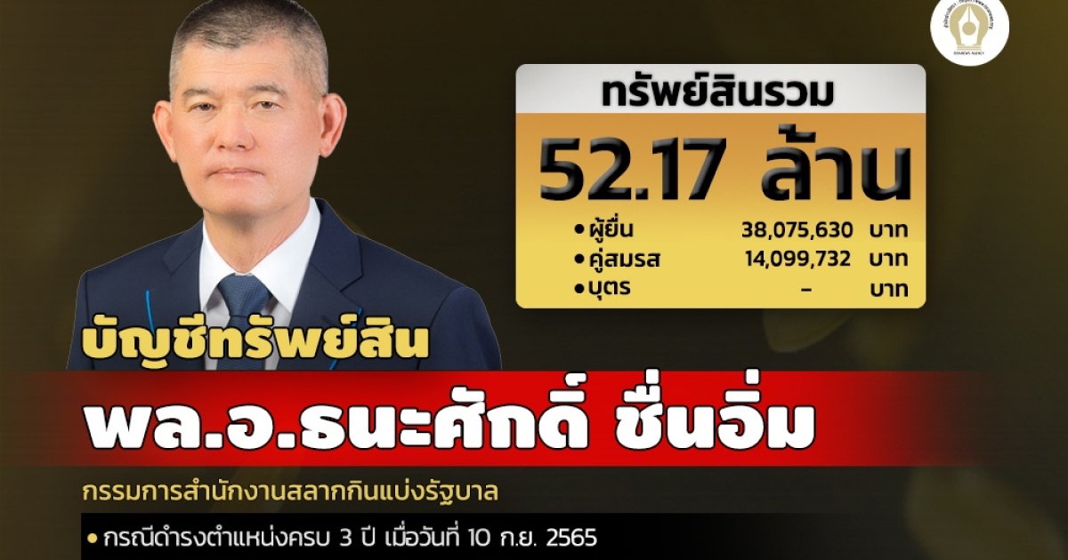 เปิดทรัพย์สิน ‘ธนะศักดิ์ ชื่นอิ่ม’ หัวหน้าฝ่ายเสธ.บิ๊กตู่ นั่งบอร์ดกองสลากครบ 3 ปี 52.17 ล. พบถือเงินฝาก 8 บัญชี 1.15 ล. เงินลงทุน 21 รายการ 3.69 ล. ที่ดิน 6 แปลง 19.1 ล. สิ่งปลูกสร้างใน ‘กทม.-นนท์-เชียงใหม่-ชุมพร’ 10.5 ล. ปืน-พระ-สร้อยอีก 20 รายการ คู่สมรสถือเครื่องประดับ 9 รายการ 9.6 แสน แจ้งมีรายได้ 4.7 ล.ต่อปี รับค่าที่ปรึกษา เอกชน 1.2 ล.
