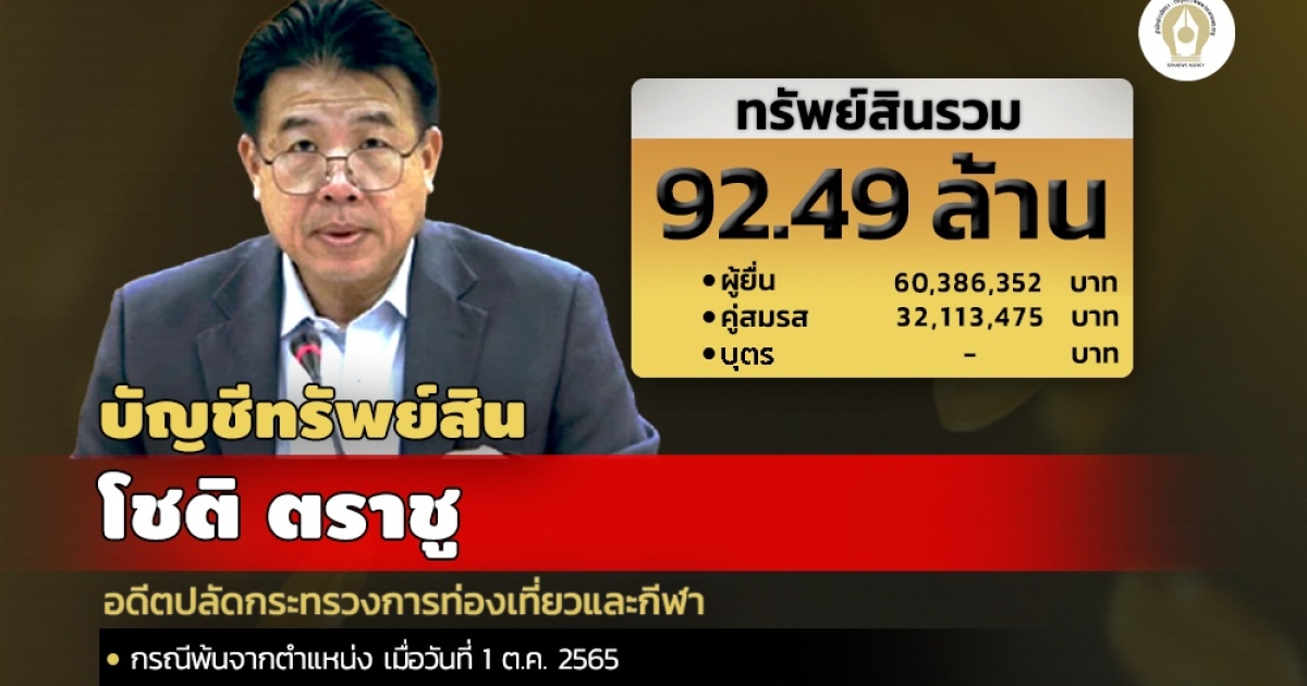 ป.ป.ช.เปิดทรัพย์สิน 'โชติ ตราชู' หลังพ้นเก้าอี้ปลัดท่องเที่ยวฯ รวย 92 ล้าน เงินฝากเพิ่มขึ้น ที่ดิน 26.6 ล้าน สะสมพระเครื่อง-ปืน-ทองคำ