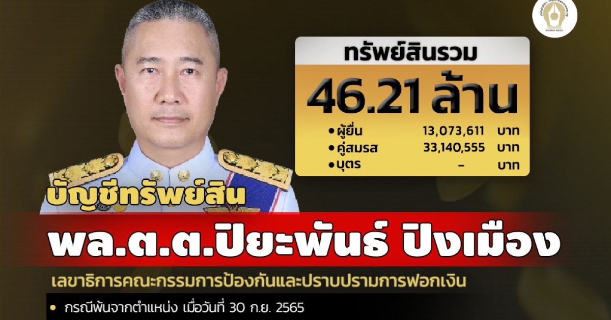 ป.ป.ช. เปิดบัญชีทรัพย์สิน 'พล.ต.ต.ปิยะพันธ์ ปิงเมือง' อดีตเลขาธิการ ปปง. พร้อมคู่สมรส มีทรัพย์สินรวมกว่า 46 ล้าน สะสมพระเครื่องชื่อดังเพียบ