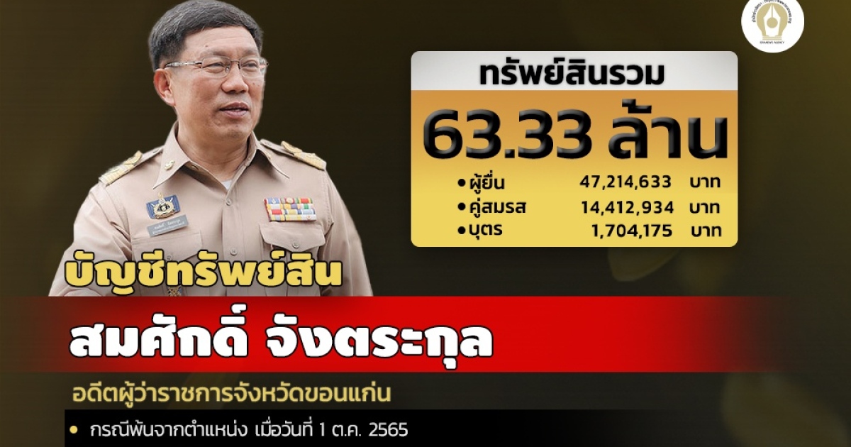 สำนักงานคณะกรรมการป้องกันและปราบปรามการทุจริตแห่งชาติ (ป.ป.ช.) เปิดเผยบัญชีทรัพย์สิน 'สมศักดิ์ จังตระกุล' หลังพ้นตำแหน่งผู้ว่าราชการจังหวัดขอนแก่น มีทรัพย์สินรวมกว่า 63 ล้าน สะสมงาช้าง 2 คู่-สร้อยคอทองคำ 26 เส้น-พระเครื่องกรอบทอง 37 องค์
