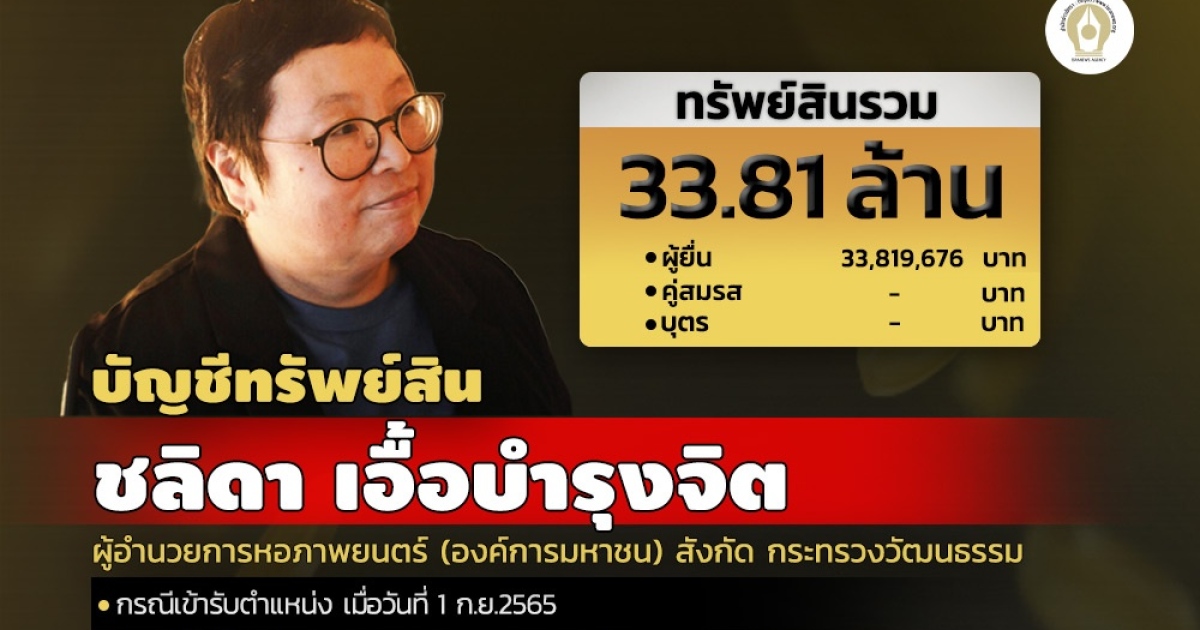 สำนักงานคณะกรรมการป้องกันและปราบปรามการทุจริตแห่งชาติ (ป.ป.ช.) เปิดเผยบัญชีแสดงทรัพย์สิน 33.81 ล.และหนี้สินของ ‘ชลิดา เอื้อบำรุงจิต’ ผู้อำนวยการหอภาพยนตร์ (องค์การมหาชน) สังกัด กระทรวงวัฒนธรรม สะสมแผ่นเสียง 400 ชุด รายได้ต่อปี 2.33 ล้าน