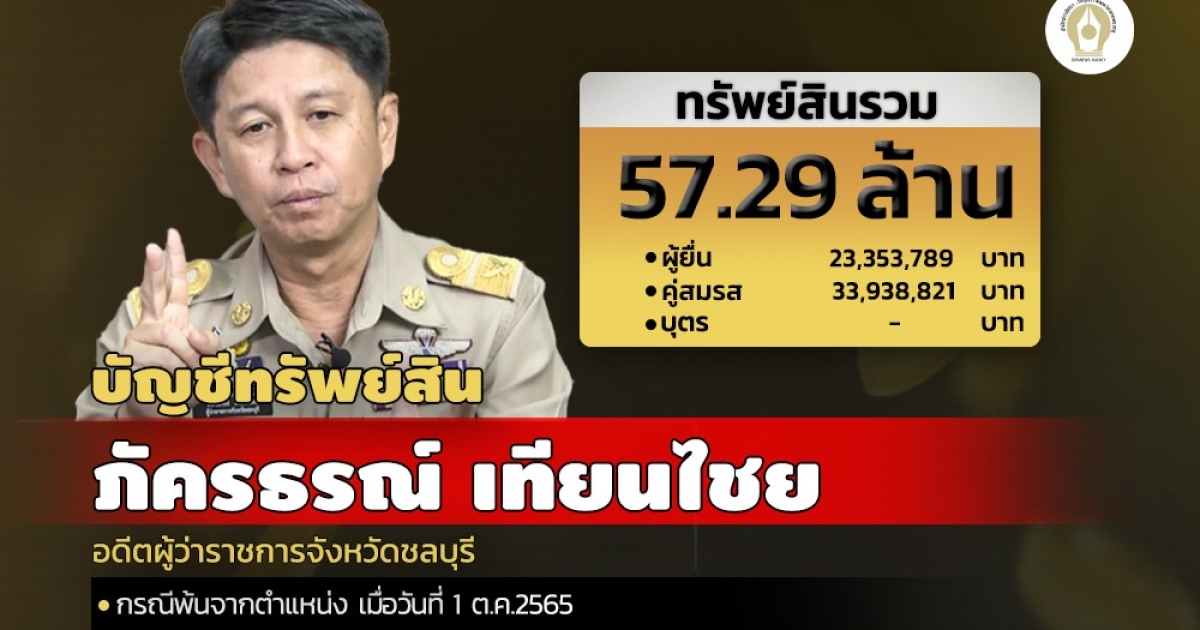 สำนักงานคณะกรรมการป้องกันและปราบปรามการทุจริตแห่งชาติ (ป.ป.ช.) เปิดเผยบัญชีแสดงทรัพย์สินและหนี้สินของ นายภัครธรณ์ เทียนไชย หลังพ้นตำแหน่งผู้ว่าราชการจังหวัดชลบุรี มีทรัพย์สินรวมกว่า 57 ล้าน สะสมเครื่องประดับ-นาฬิกา-แหวน-พระเครื่องประเมิณลูค่ามิได้ รายได้ต่อปี 2 ล้าน