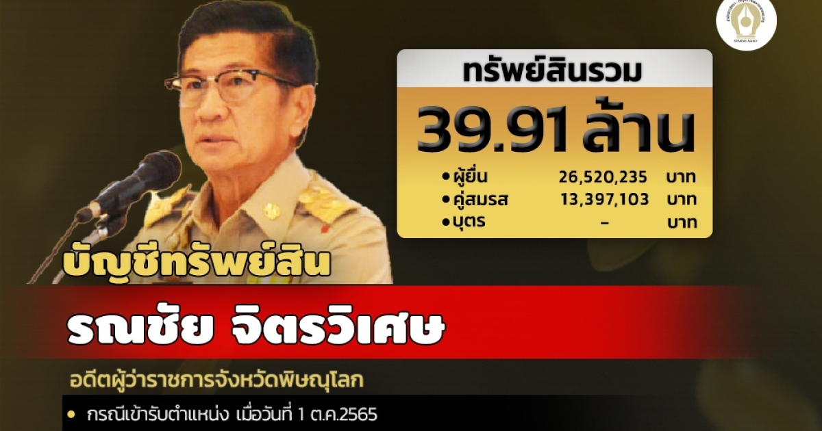 สำนักงานคณะกรรมการป้องกันและปราบปรามการทุจริตแห่งชาติ (ป.ป.ช.) เปิดเผยบัญชีแสดงทรัพย์สินและหนี้สินของ นายรณชัย จิตรวิเศษ อดีตผู้ว่าราชการจังหวัดพิษณุโลก แจ้งมีมีทรัพย์สินรวมกว่า 39 ล้าน พระเครื่อง 20 องค์ นาฬิกาข้อมือ 3 เรือน แหวนเพชรเพียบ เครื่องประดับ หลายรายการ