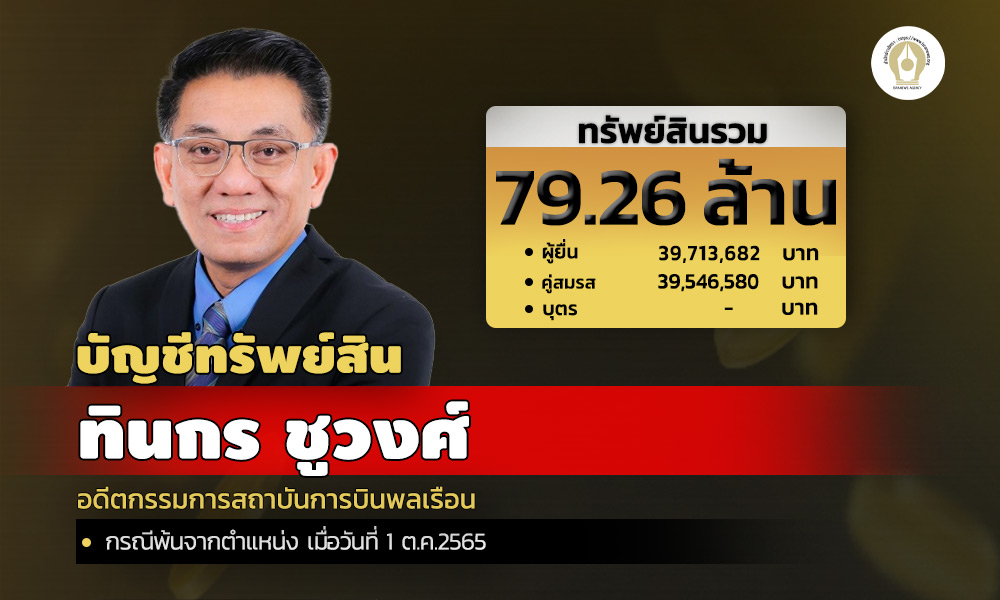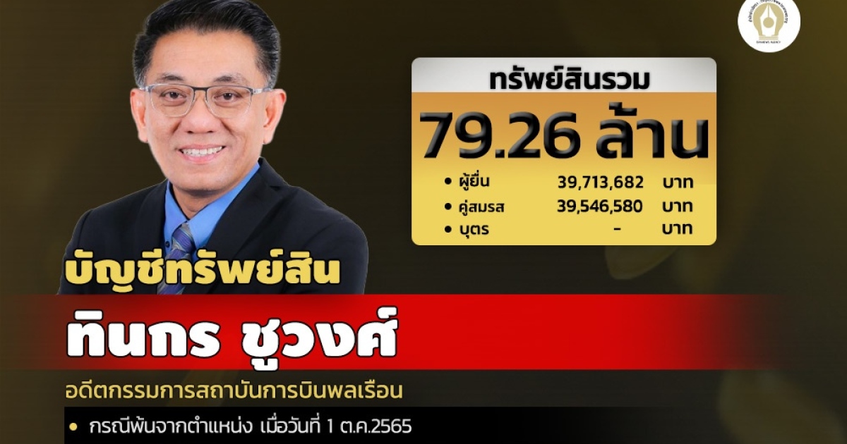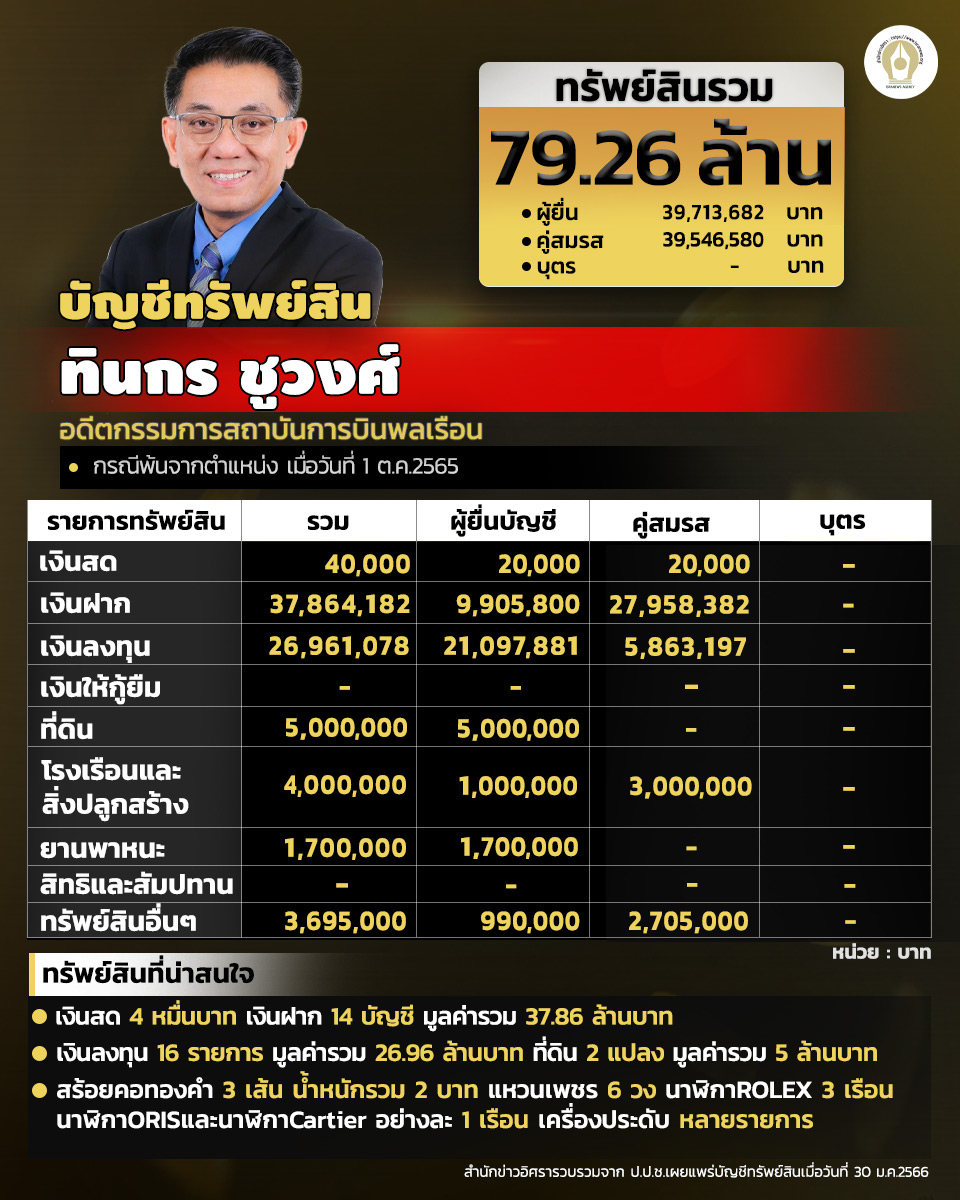 สำนักงานคณะกรรมการป้องกันและปราบปรามการทุจริตแห่งชาติ (ป.ป.ช.) เปิดเผยบัญชีแสดงทรัพย์สินและหนี้สินของนายทินกร ชูวงศ์ กรณีพ้นตำแหน่งกรรมการสถาบันการบินพลเรือน แจ้งมีทรัพย์สินรวมกว่า 79 ล้าน ไร้หนี้สิน ลงทุนเพียบ สะสมแหวนเพช-สร้อยคอทองคำ นาฬิกาROLEX,ORISและ CARTIER