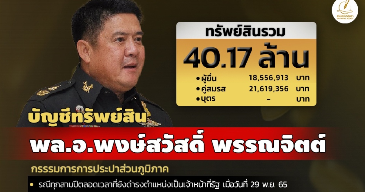 สำนักงานคณะกรรมการป้องกันและปราบปรามการทุจริตแห่งชาติ (ป.ป.ช.) เปิดเผยบัญชีแสดงทรัพย์สินและหนี้สินของ พลเอกพงษ์สวัสดิ์ พรรณจิตต์ กรรมการ การประปาส่วนภูมิภาค (กปภ.) พระเครื่อง พระบูชา พระพุทธรูป ประเมินค่าไม่ได้ หลายรายการ