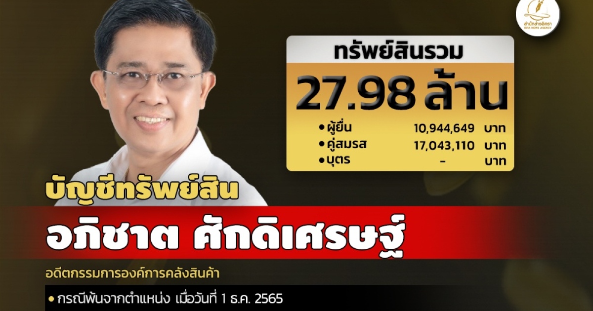 สำนักงานคณะกรรมการป้องกันและปราบปรามการทุจริตแห่งชาติ (ป.ป.ช.) เปิดเผยบัญชีแสดงทรัพย์สินและหนี้สินของนายอภิชาต ศักดิเศรษฐ์ อดีตกก.องค์การคลังสินค้า โดยแจ้งมีทรัพย์สิน 27 ล้าน สะสมที่ดินรวม14 แปลง โรงเรือนและสิ่งปลูกสร้าง 4 หลัง