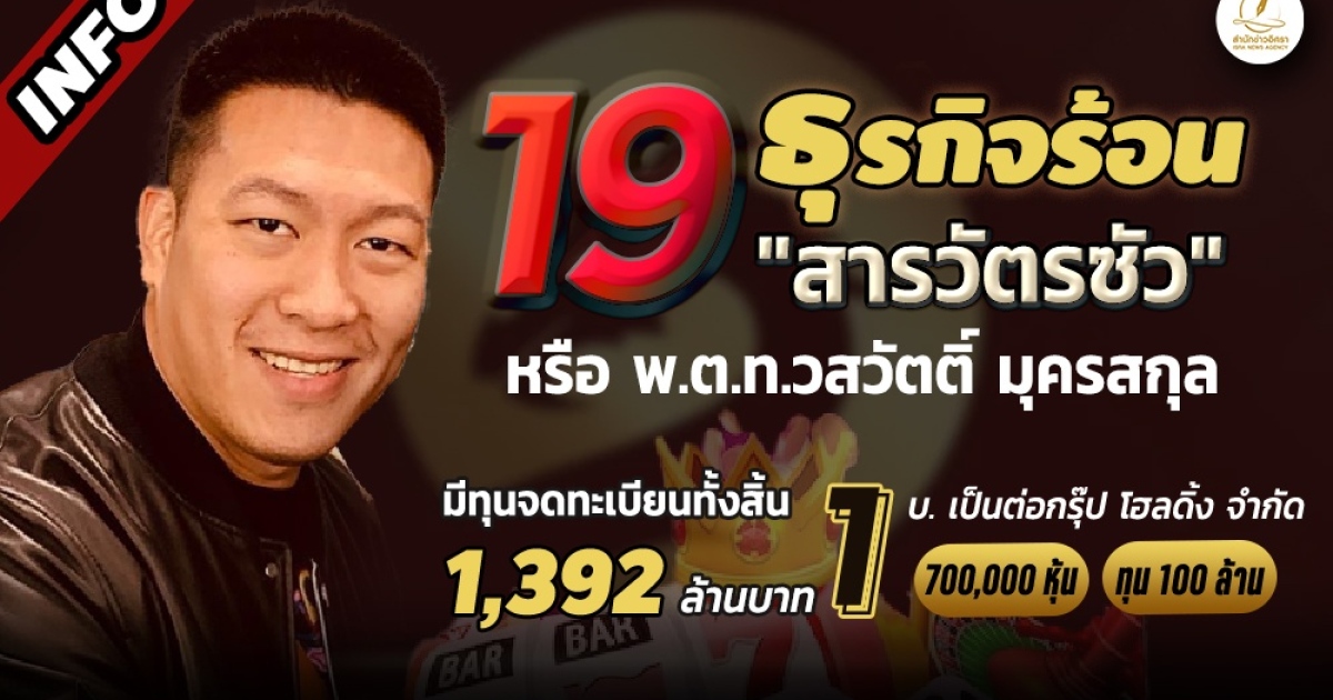 อัพเดทข้อมูลธุรกิจ ‘สารวัตรซัว’ พ.ต.ท.วสวัตติ์ มุครสกุล ไม่ใช่แค่ 9 บริษัท ล่าสุดพบถือหุ้นชื่อส่วนตัวพร้อม‘เป็นต่อกรุ๊ป’ อีก 10 บ. รวมทุนจดทะเบียน19 แห่ง 1,392 ล้าน บ.เน็คซ์ เซ็พ เพาเวอร์ ลิ่ว 548 ล. - ไวเพย์ 400 ล. ในหัวกรุ๊ป 200 ล. ก่อตั้ง 'ทุนเรียนแลนด์ อ.ท่าใหม่ จ.จันทบุรี เดือน ส.ค.2565 ด้วย