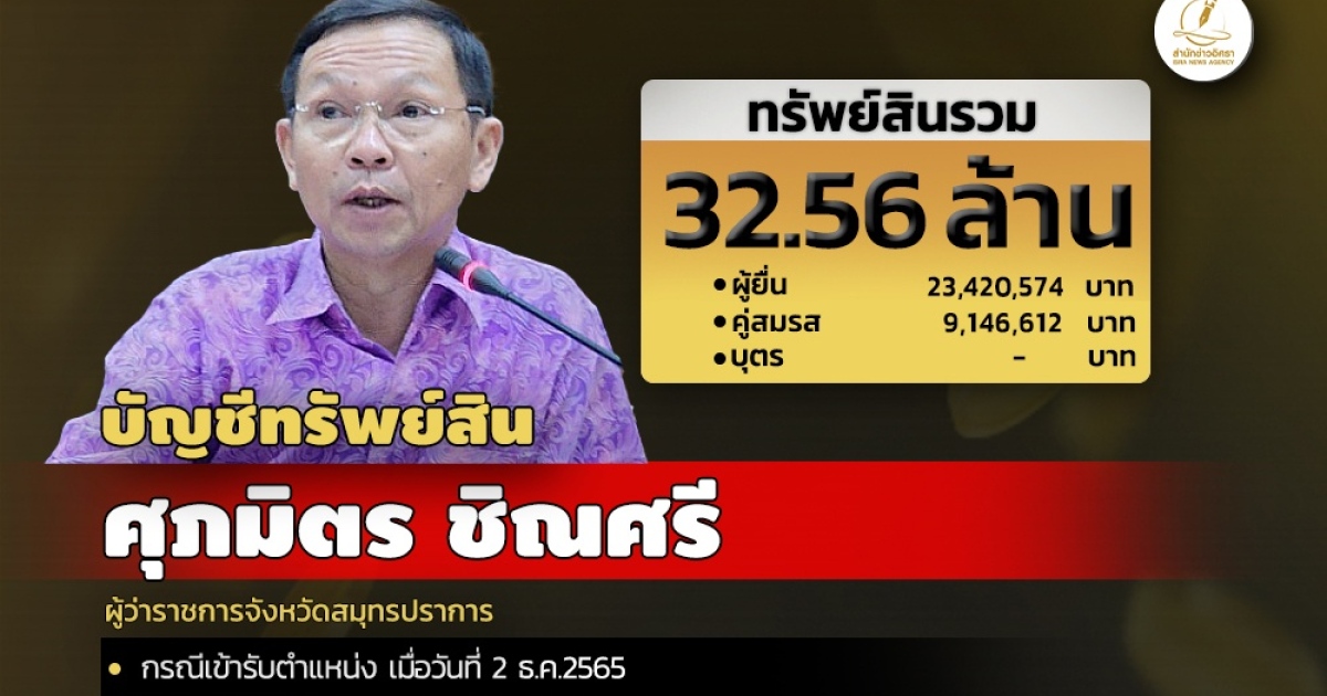 สำนักงานคณะกรรมการป้องกันและปราบปรามการทุจริตแห่งชาติ (ป.ป.ช.) เปิดเผยบัญชีแสดงทรัพย์สินและหนี้สินของ นายศุภมิตร ชิณศรี ผู้ว่าราชการจังหวัดสมุทรปราการ โดยแจ้งมีทรัพย์สินกว่า 32.56 ล้าน เงินสด 9แสนบาท ทรัพย์สินที่น่าสนใจอาทิ ทองคำแท่งหนักรวม 205 บ. พระเครื่องเลี่ยมทอง-พระซุ้มกอเลี่ยมทองและเครื่องประดับอีกหลายรายการ