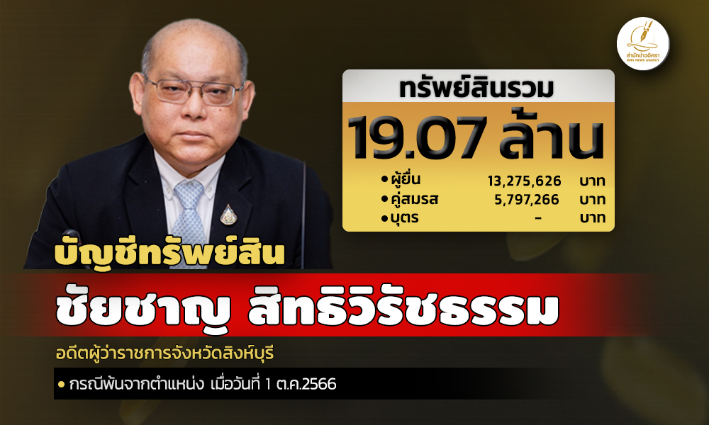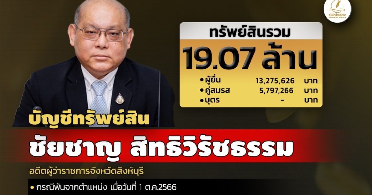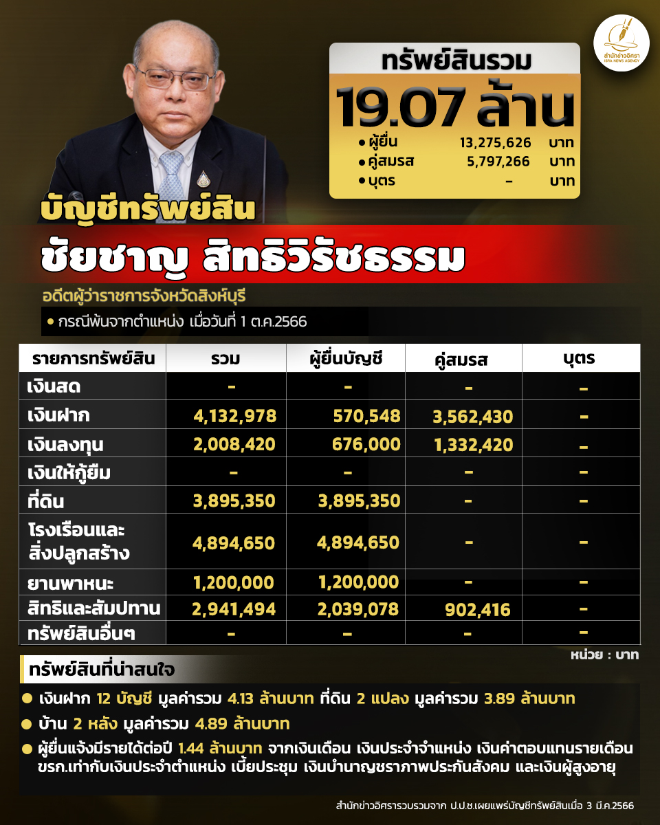 สำนักงานคณะกรรมการป้องกันและปราบปรามการทุจริตแห่งชาติ (ป.ป.ช.) เปิดเผยบัญชีแสดงทรัพย์สินและหนี้สินของ นายชัยชาญ สิทธิวิรัชธรรม ผู้ว่าราชการจังหวัดสิงห์บุรี โดยแจ้งมี ทรัพย์สินกว่า 19 ล้าน อาทิ บ้าน2 หลัง4.89 ล. รายได้ 1.4 ล้านต่อปี