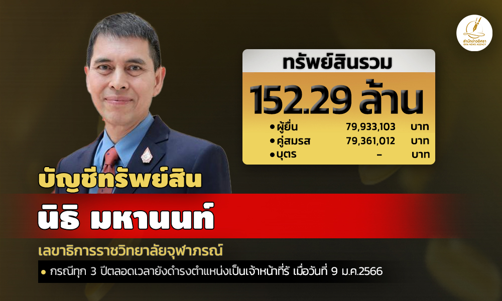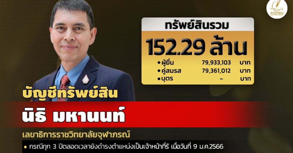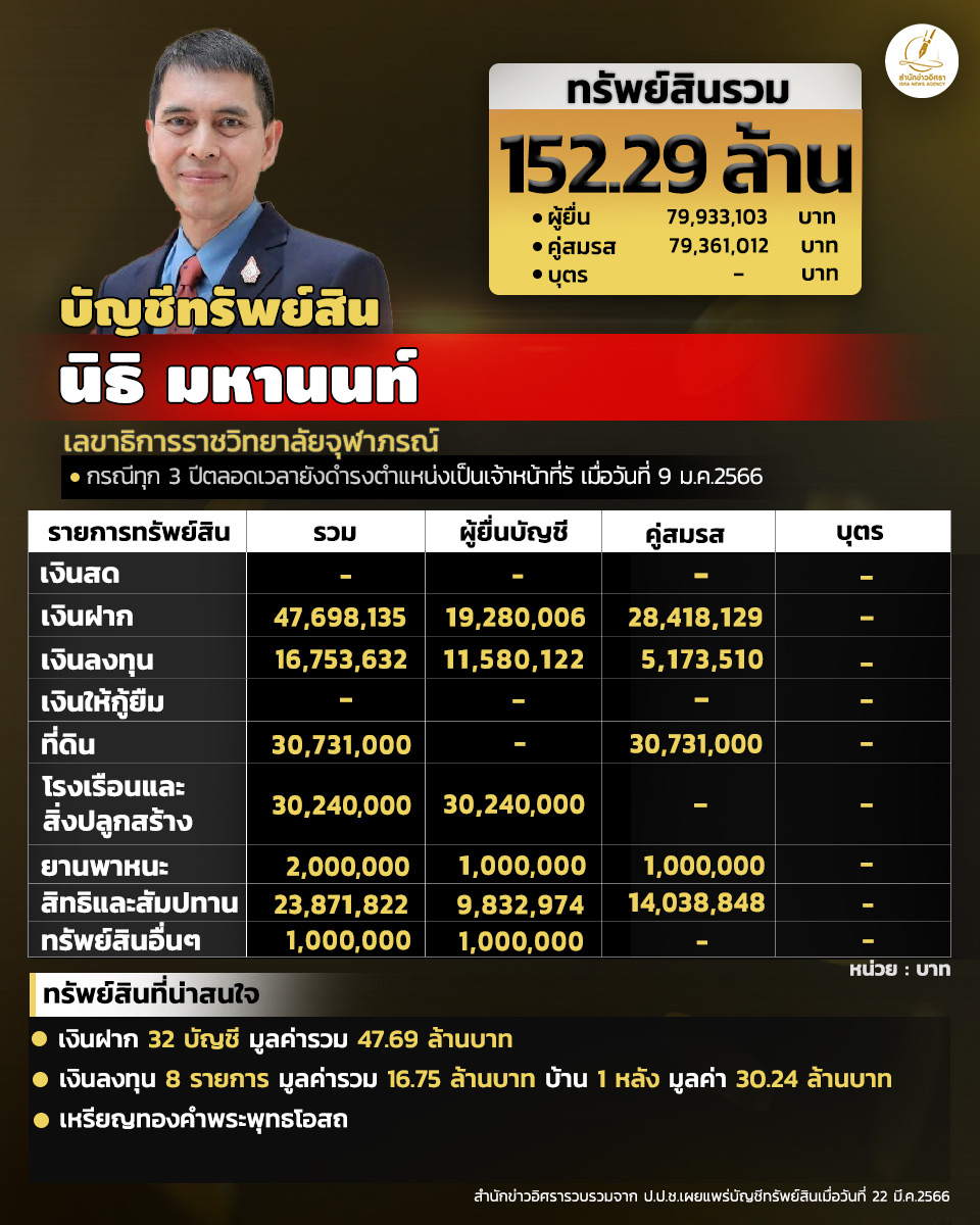 สำนักงานคณะกรรมการป้องกันและปราบปรามการทุจริตแห่งชาติ (ป.ป.ช.) เปิดเผยบัญชีแสดงทรัพย์สินและหนี้สินของ นายนิธิ มหานนท์ เลขาธิการราชวิทยาลัยจุฬาภรณ์ โดยแจ้งมี ทรัพย์สิน 152.29 ล. อาทิ เงินฝาก 32 บัญชี 47.69 ล้าน มีบ้านมูลค่า 30 ล.ที่เขตคลองเตย กรุงเทพฯ ทรัพย์สินที่น่าสนใจมี หรียญทองคำพระพุทธโอสถ 1 ล.