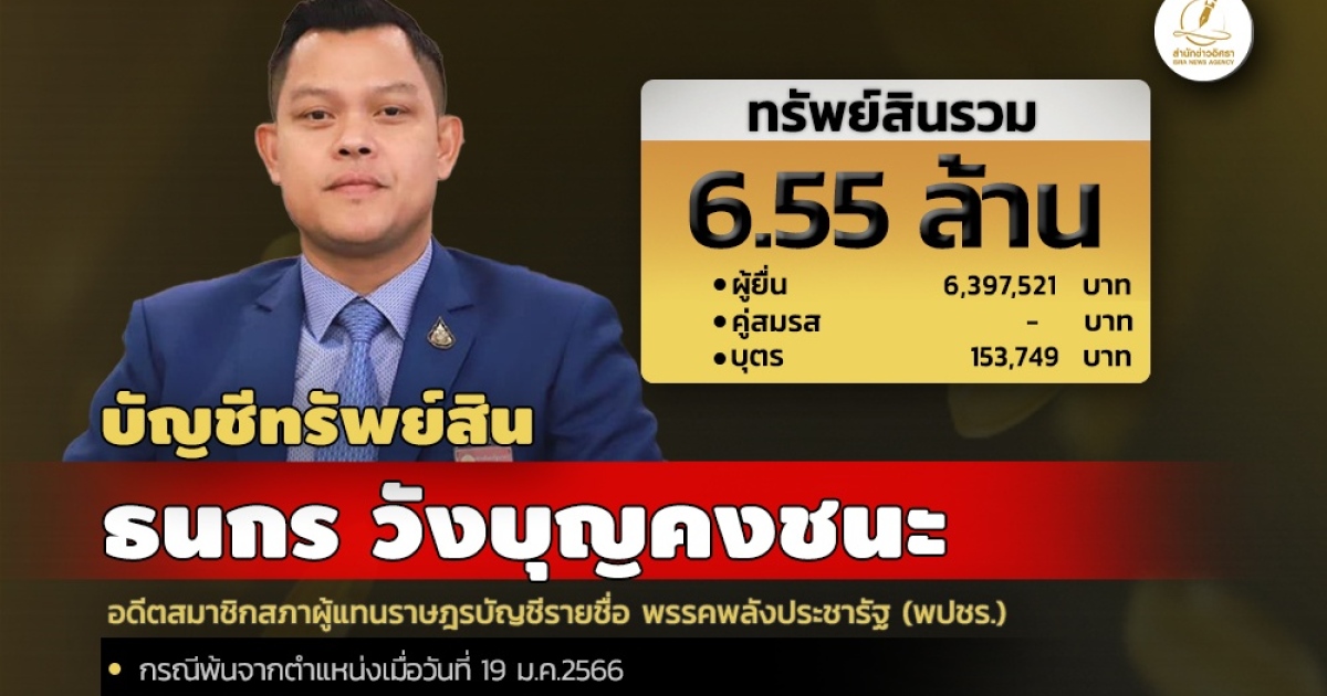 สำนักงานคณะกรรมการป้องกันและปราบปรามการทุจริตแห่งชาติ (ป.ป.ช.) เปิดเผยบัญชีแสดงรายการทรัพย์สินและหนี้สินของนายธนกร วังบุญคงชนะ อดีต ส.ส.บัญชีรายชื่อ พรรคพลังประชารัฐ (พปชร.) โดยแจ้งมีทรัพย์สินกว่า 6.55 ล. อาทิ ที่ดิน 1 ล. ทรัพย์สินที่น่าสนใจมี สร้อยคอทองคำ 5บาทพร้อมพระเลี่ยมทอง และ นาฬิกาPATEK PHILLIPE NAUTILUS
