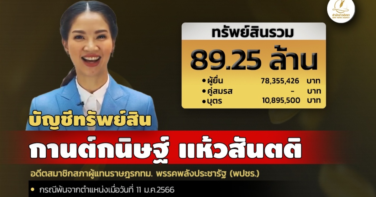 สำนักงานคณะกรรมการป้องกันและปราบปรามการทุจริตแห่งชาติ (ป.ป.ช.) เปิดเผยบัญชีแสดงรายการทรัพย์สินและหนี้สินของน.ส.กานต์กนิษฐ์ แห้วสันตติ อดีต ส.ส.กทม. พรรคพลังประชารัฐ (พปชร.) โดยแจ้งมีทรัพย์สิน89.25 ล. อาทิ เงินฝาก 14 บัญชี 14.44 ล้านบาท บ้าน 3 หลัง มูลค่ารวม 39.66 ล. ทรัพย์สินที่น่าสนใจมี ชุดเครื่องเพชร แหวนเพชร4กะรัตทรงเหลี่ยม และเครื่องประดับอีกหลายรายการ