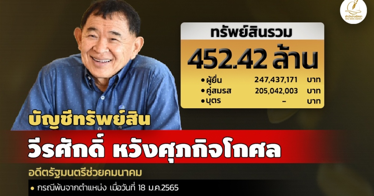 สำนักงานคณะกรรมการป้องกันและปราบปรามการทุจริตแห่งชาติ (ป.ป.ช.) เปิดเผยบัญชีแสดงทรัพย์สินและหนี้สินของ นายวีรศักดิ์ หวังศุภกิจโกศล อดีต รมช.คมนาคม โดยแจ้งมี ทรัพย์สิน 452.42 ล้าน.อาทิ เงินฝาก 10 บัญชี มูลค่ารวม 2.64 ล. และให้ลูกสาว 2 คนกู้ยืมหลายร้อยล้านบาท ทรัพย์สินที่น่าสนใจมีอาวุธปืน 26 กระบอก-สร้อยคอทองคำ-กระเป๋าหรู และมีรายได้ 163 ล./ปี จากเงินเดือน ค่าเช่าที่ และ การขายหุ้น