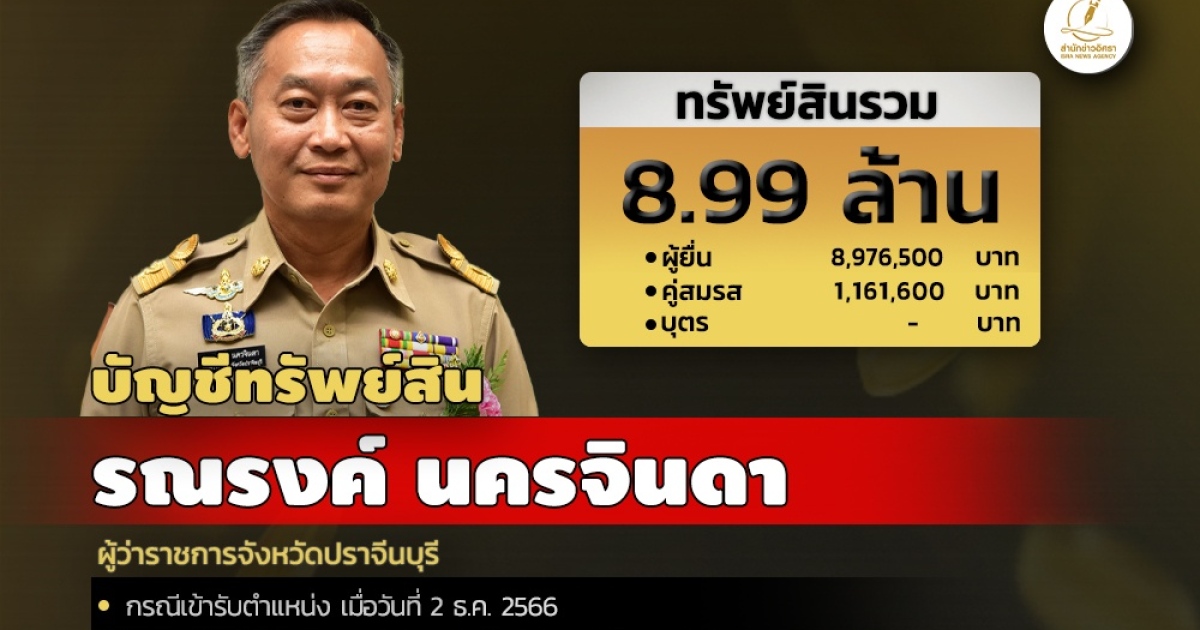 สำนักงานคณะกรรมการป้องกันและปราบปรามการทุจริตแห่งชาติ (ป.ป.ช.) เปิดเผยบัญชีแสดงทรัพย์สินและหนี้สินของ นายรณรงค์ นครจินดา ผู้ว่าราชการจังหวัดปราจีนบุรี โดยแจ้งมี ทรัพย์สินกว่า 8.9 ล้าน มีกองทุนบำแหน็จบำนาญ มูลค่า 1.78 ล. และแจ้งมีรายได้ 1.16 ล./ปี