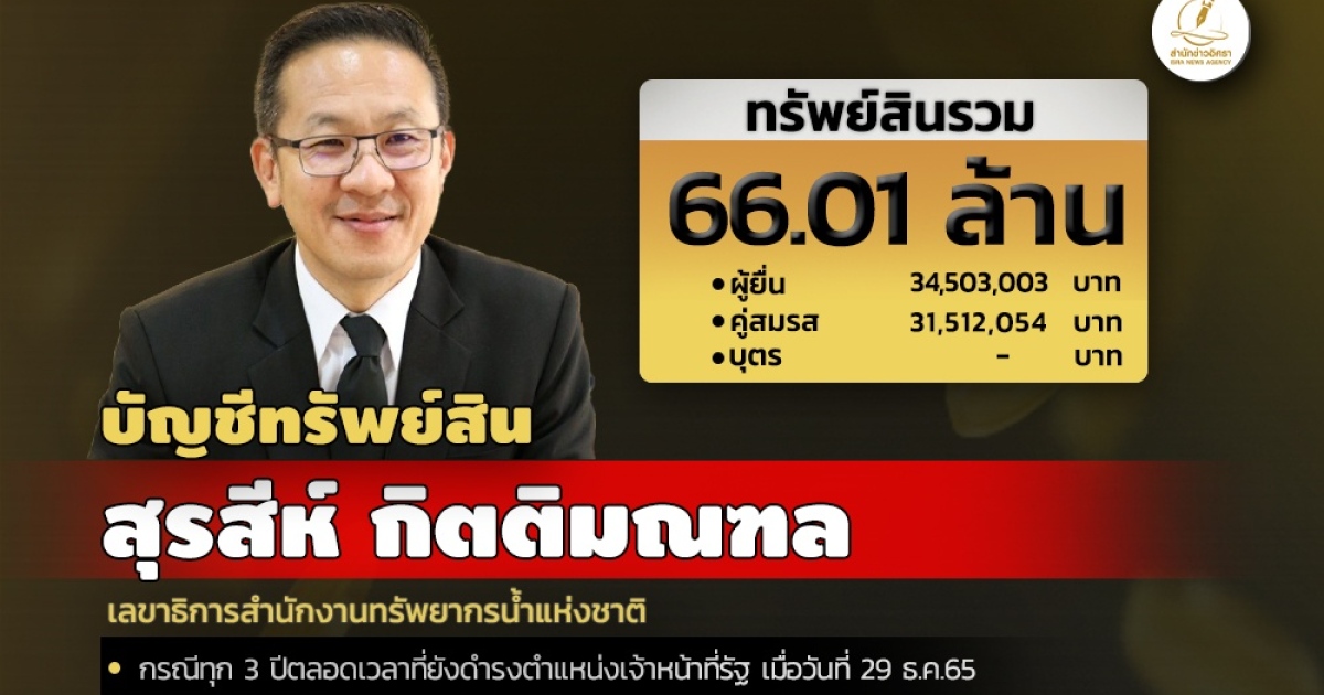 สำนักงานคณะกรรมการป้องกันและปราบปรามการทุจริตแห่งชาติ (ป.ป.ช.) เปิดเผยบัญชีแสดงทรัพย์สินและหนี้สินของ นายสุรสีห์ กิตติมณฑล เลขาธิการสำนักงานทรัพยากรน้ำแห่งชาติ โดยแจ้งมี ทรัพย์สินกว่า 66 ล้าน อาทิ เงินฝาก 14 บัญชี มูลค่ารวม 16.45 ล. ที่ดิน 8 แปลง มูลค่ารวม 34.11 ล. อาทิ ที่ดินจ.นครราชสีมา ทรัพย์สินที่น่าสนใจ ผู้ยื่นมีสะสมพระเครื่อง-สร้อยคอทองคำ และแจ้งมีรายได้ 2 ล./ปี