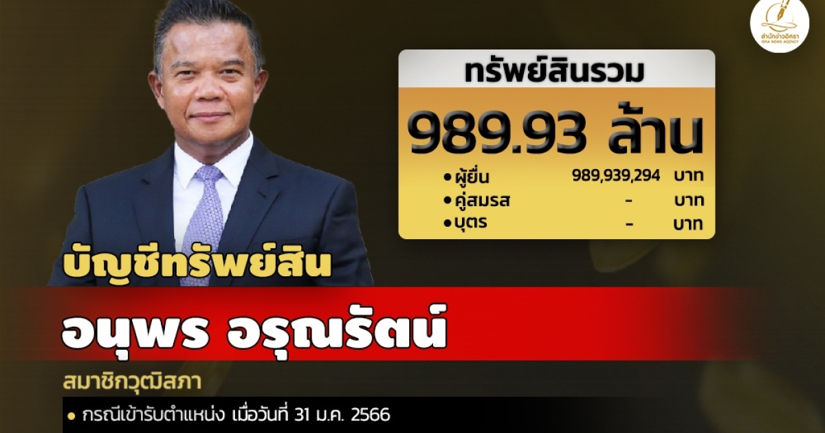 สำนักงานคณะกรรมการป้องกันและปราบปรามการทุจริตแห่งชาติ (ป.ป.ช.) เปิดเผยบัญชีแสดงทรัพย์สินและหนี้สินของ นายอนุพร อรุณรัตน์ โดยแจ้งมีทรัพย์สินกว่า 989.93 ล้าน เงินฝาก 45 บัญชี มูลค่ารวม 219.61 ล.ที่ดิน 11 แปลง มูลค่ารวม 43ล. ทรัพย์สินที่น่าสนใจมีสะสมทองคำแท่ง-นาฬิกายีห้อดัง-เหรียญทองคำ 2,710 เหรียญ