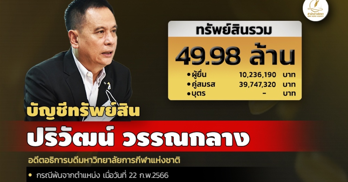 สำนักงานคณะกรรมการป้องกันและปราบปรามการทุจริตแห่งชาติ (ป.ป.ช.) เปิดเผยบัญชีแสดงทรัพย์สินและหนี้สินของ นายปริวัฒน์ วรรณกลาง อดีตอธิการบดีมหาวิทยาลัยการกีฬาแห่งชาติ โดยแจ้งมีทรัพย์สินกว่า 49 ล้าน อาทิ เงินลงทุน 4 รายการ มูลค่ากว่า22 ล. ทรัพย์สินที่น่าสนใจมีพระเลี่ยมทอง 6 องค์ พระเครื่อง 7 องค์ งาช้าง 2 กิ่ง