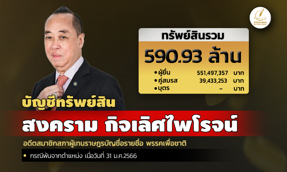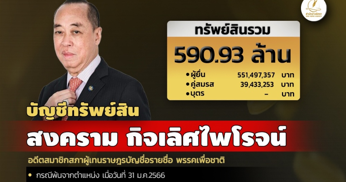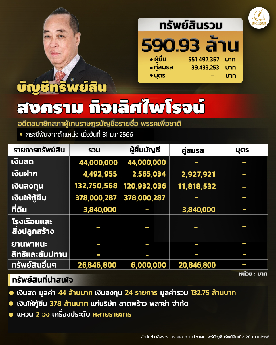 เมื่อวันที่ 28 เม.ย. 2566 สำนักงานคณะกรรมการป้องกันและปราบปรามการทุจริตแห่งชาติ (ป.ป.ช.) เปิดเผยบัญชีแสดงรายการทรัพย์สินและหนี้สินของ ส.ส.ที่พ้นจากตำแหน่ง 'สงคราม กิจเลิศไพโรจน์' อดีต ส.ส.บัญชื่อรายชื่อ พรรคเพื่อชาติ แจ้งมีทรัพย์สินทั้งสิ้น 590.93 ล. อาทิ เงินสด 44 ล. เงินให้กู้ยืม 378 ล. ทรัพย์สินที่น่าสนใจ มีเครื่องประดับหลายรายการ