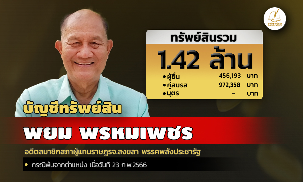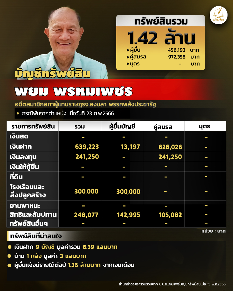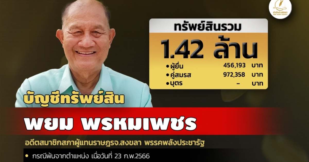 สำนักงานคณะกรรมการป้องกันและปราบปรามการทุจริตแห่งชาติ (ป.ป.ช.) เปิดเผยบัญชีแสดงรายการทรัพย์สินและหนี้สินนายพยม พรหมเพชร อดีต ส.ส.สงขลา พรรคพลังประชารัฐ โดยแจ้งมีทรัพย์สิน 1.42 ล. อาทิมีเงินฝาก 9 บัญชี มูลค่ารวม 6.39แสน และแจ้งมีรายได้ต่อปี 1.36 ล.