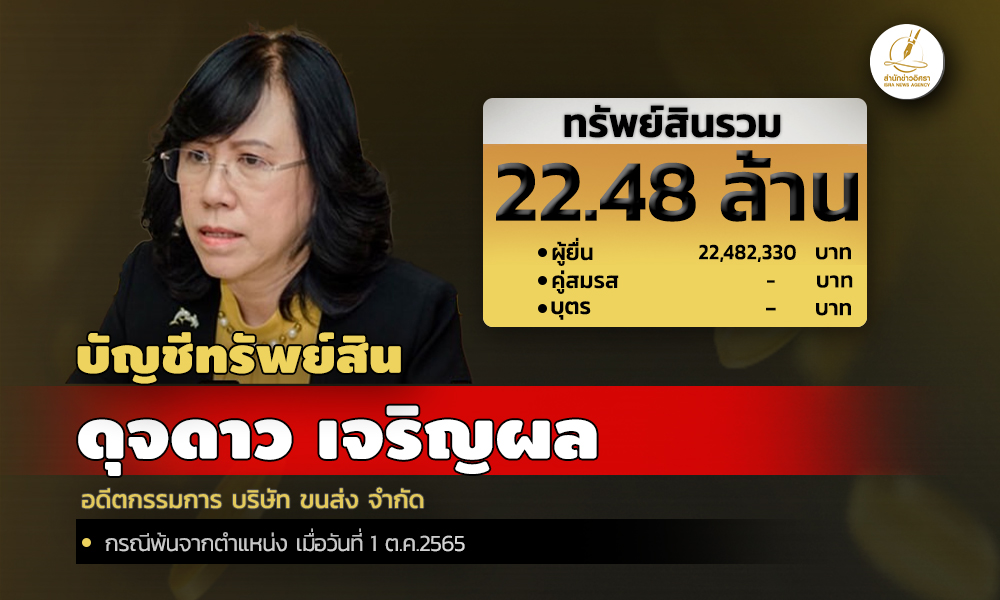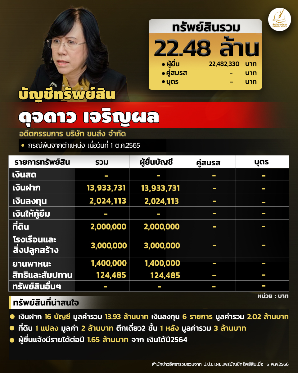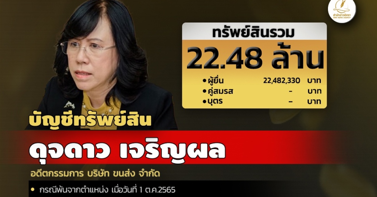 สำนักงานคณะกรรมการป้องกันและปราบปรามการทุจริตแห่งชาติ (ป.ป.ช.) เปิดเผยบัญชีแสดงทรัพย์สินและหนี้สินของ น.ส.ดุจดาว เจริญผล อดีต กรรมการ บริษัท ขนส่ง จำกัด โดยแจ้งมี ทรัพย์สินกว่า 22 ล้าน เงินฝาก 16 บัญชี 13.93 ล. มีที่ดินและตึกเดี่ยวที่บางใหญ่ จ.นนทบุรี และแจ้งมีรายได้ 1.65 ล./ปี