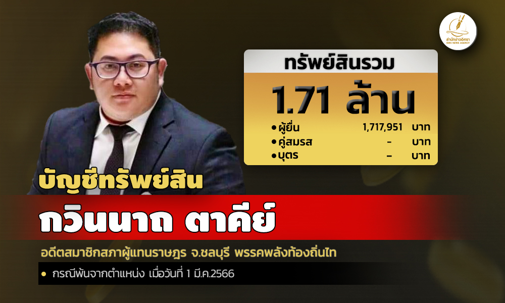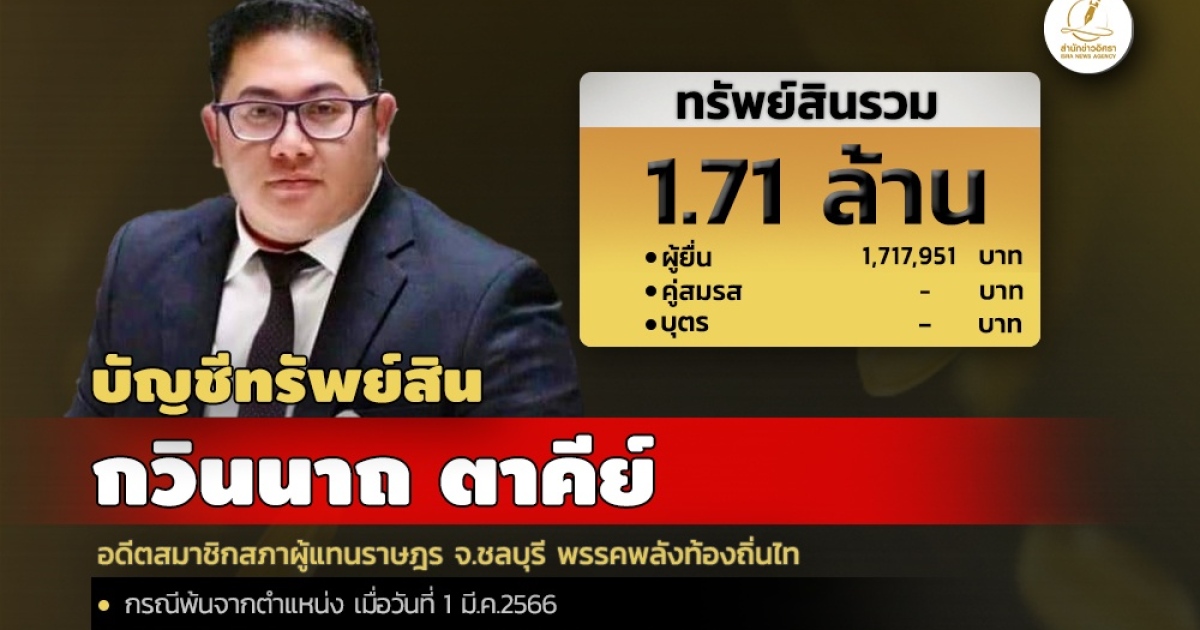 สำนักงานคณะกรรมการป้องกันและปราบปรามการทุจริตแห่งชาติ (ป.ป.ช.) เปิดเผยบัญชีแสดงรายการทรัพย์สินและหนี้สินของ น.ส.กวินนาถ ตาคีย์ อดีต ส.ส.ชลบุรี พรรคพลังท้องถิ่นไท โดยแจ้งมี ทรัพย์สิน 1.71 ล. อาทิ เงินฝาก 54,512 บาท โรงเรือนและสิ่งปลูกสร้าง 1.66 ล. เป็นห้องชุด 2 รายการ และแจ้งมีรายได้ต่อปี 1.36 ล.จากเงินเดือน และเงินเพิ่มส.ส.