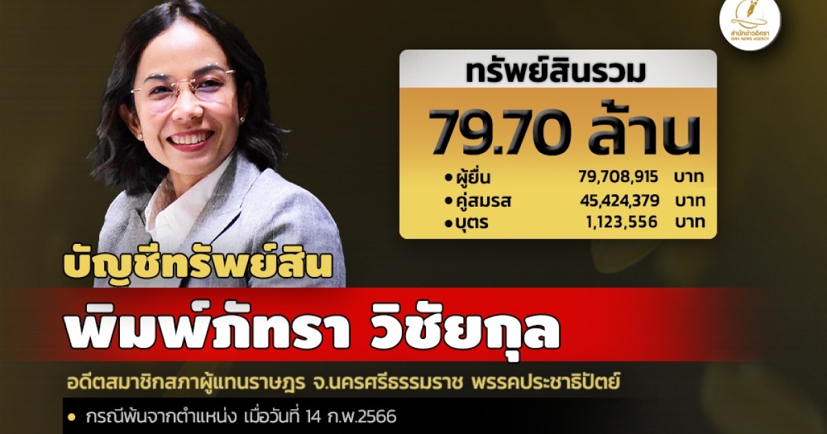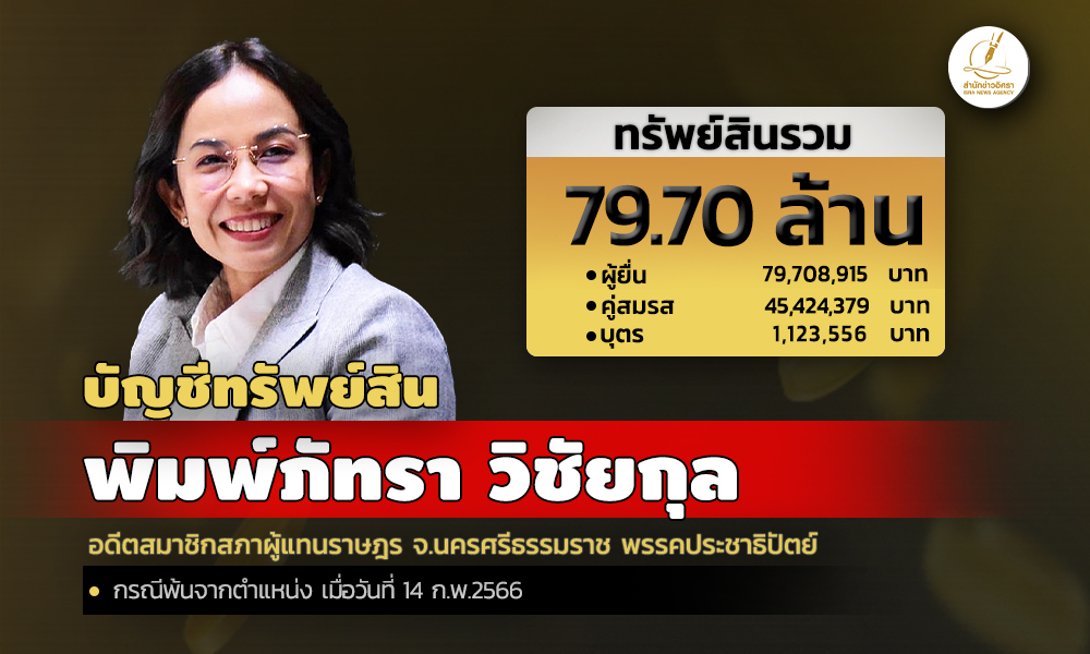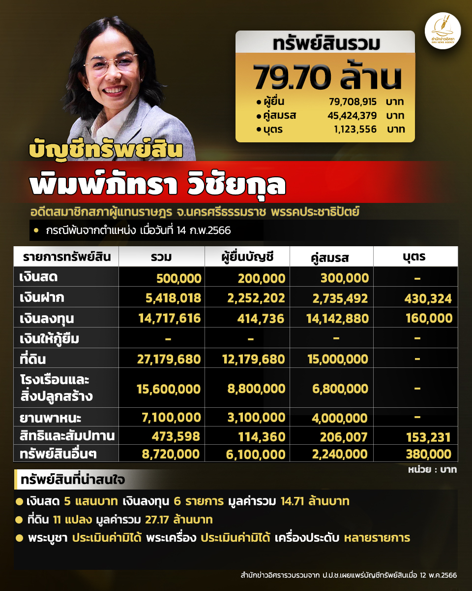 สำนักงานคณะกรรมการป้องกันและปราบปรามการทุจริตแห่งชาติ (ป.ป.ช.) เปิดเผยบัญชีแสดงรายการทรัพย์สินและหนี้สิน 'พิมพ์ภัทรา วิชัยกุล' อดีตส.ส.นครศรีธรรมราช พรรคประชาธิปัตย์ โดยแจ้งมีทรัพย์สินทั้งสิ้น 79.70 ล. อาทิ เงินลงทุน 4 รายการ มูลค่ารวม 14.71 ล. ที่ดิน 11 แปลง มูลค่ารวม 27.17 ล. ทรัพย์สินที่น่าสนใจมี พระบูชาและพระเครื่อง ประเมินค่ามิได้ และมีเครื่องประดับ หลายรายการ